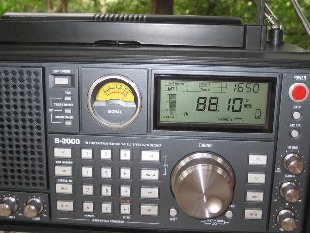 。。。。。。通过多次调试,自己才明白当收听远距离FM信号时必须按该机的【ANT.ATT】键把它调到最大值,与此同时还得把该机的【BW】键设置在【NARROW】位置,才能获得最佳的收听效果!按说明书使用操作,此时的 S2000收听到的香港商业一台89.5非常清晰哟,之前的三重唱变得清纯的商业一台信号源!真是给了我一个惊喜!!而SANGEAN ATS909和SONY7600GR就无法听得清纯的商台信号源;再把三机子调到88.1。此时的S2000同样能听到商台信号,可听度能听得懂,而SANGEAN ATS909和SONY7600GR在88.1频段就显得无能无力了听到纯商台信号源的信息。本次还多选了几个香港台作对比 看看图链接 6 考虑到香港台的频率左右会有邻频的“夹击”,为了避免“弱肉强食”的可能性,此时操作事先把【改变调谐步进】设置在慢挡(例如收听94.8时就得避开佛山台94.6强信号,只能调到94.84避开它)用上面同样的操作方法就可以收听到以上香港台信号源,通过对比,最后得出结果:在调频接收方面S2000效果最好、SANGEAN ATS909次之、效果最不好是SONY7600GR!因为后两者的机子调频步进最小调试跟S2000有别。所以在FM方面接收性能S2000>SANGEAN ATS909>SONY7600GR!