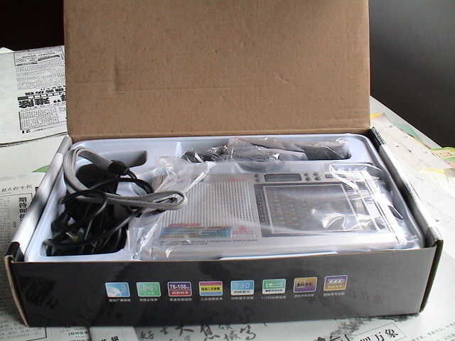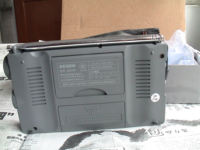 左下角是德劲公司的机标了。写明爱好者7号,短波跟踪式二次变频立体声、在档灵敏度选择、单声道/立体声选择、超重低音选择、定时开机/睡眠关机功能、旋转式波段切换12波段接收、音量数字提示、智能充电功能、时钟显示/夜间照明等收音机特点,右方是中央人民广播电台《中国之声》专用产品的圆标,很不顺眼!