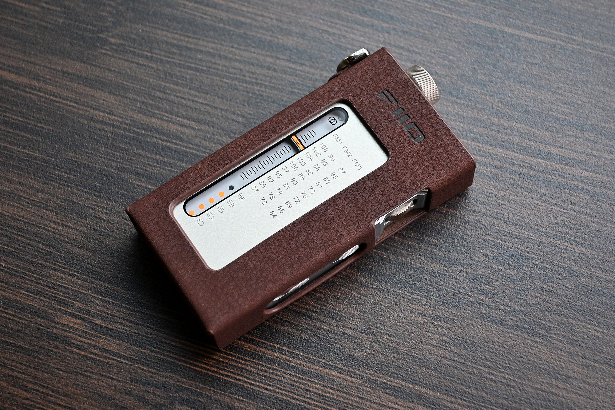 当然,作为内测购买用户(提问题,收集产品意见),除了后背有独立编号外,还额外赠送了棕色皮套和耳机(具体型号为FF1,这可是飞傲的平头热销款,也由此看出厂商的诚意)。皮质收纳包做得很精致,开口处一角还有挂绳孔,可搭配挂在脖颈上。不过要注意的是,机身一旦收纳后还是很紧实的,要想拔出来就比较困难了。