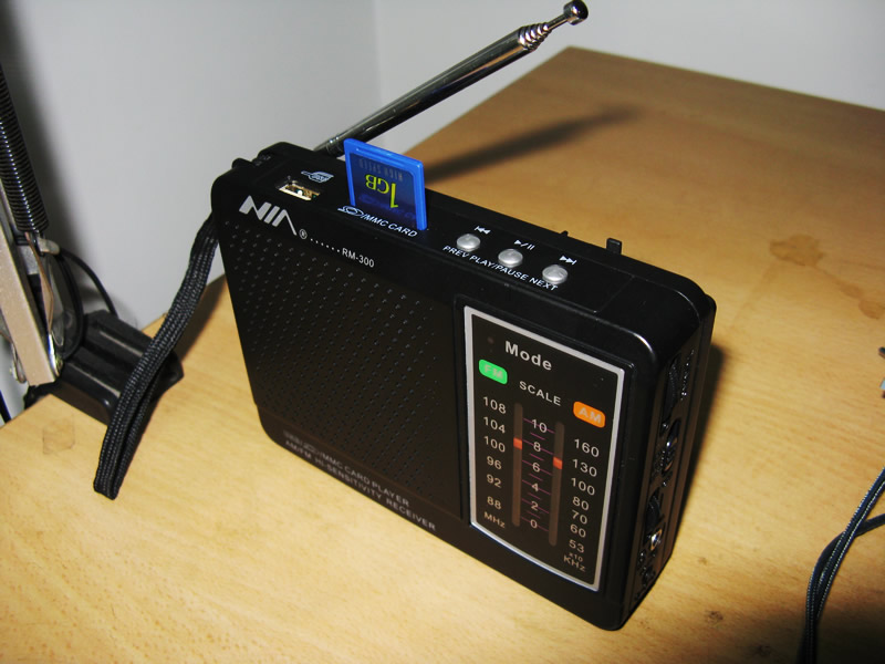 2011 年08月28日入手NIA rm-300 ,这是一款插卡收音机,支持u盘,sd卡输入,调频和中波,今天上午才收到,现在一直在用此机测试性能,从上午到现在一在播sd卡中的英文音频 ,感觉良好,声音清脆,达到我听声音文件所需的音质要求。此机的指示灯切换转灯很不错,mp3播放时是蓝色的灯,相当有梦幻的感觉,播放时会闪动,暂停时会不闪,很有特色,一般收音机的指未灯大多是红绿黄,蓝色真少见,此今天才到手,性能介绍待续…