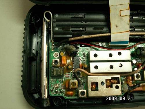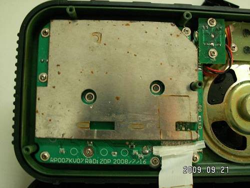 关于做这次007浸水试验,我相信有许多爱好者有同样的愿望,我是相信厂方的说法,也相信试验后机器肯定不会有大碍,结果也差不多,因此敢这样做,欢迎指正,就机论机.在昨天浸了二次水,第一次最深有最30公分,第二次是漂在水上,但时间有二分多钟,拿上来后甩出过一些水,放了后24小时后打开,有些有金属屏蔽罩的地方有锈,线路板经过防水处理,上面象有蜡,也可能是防水胶,但许多装配细节上不到位,在图上可以看出,最后三张是装好后上电拍的,各波段收听正常(耳朵感觉).