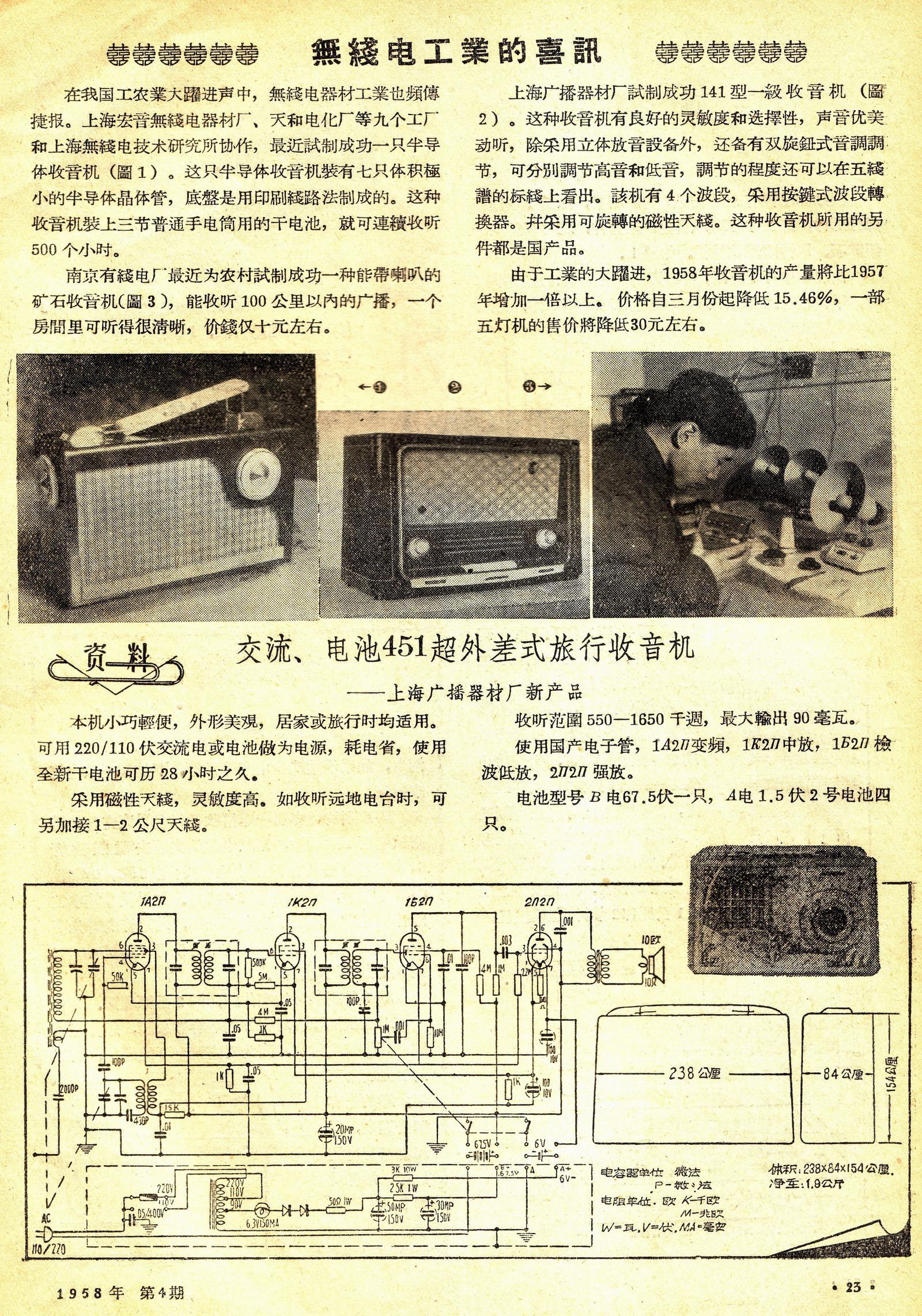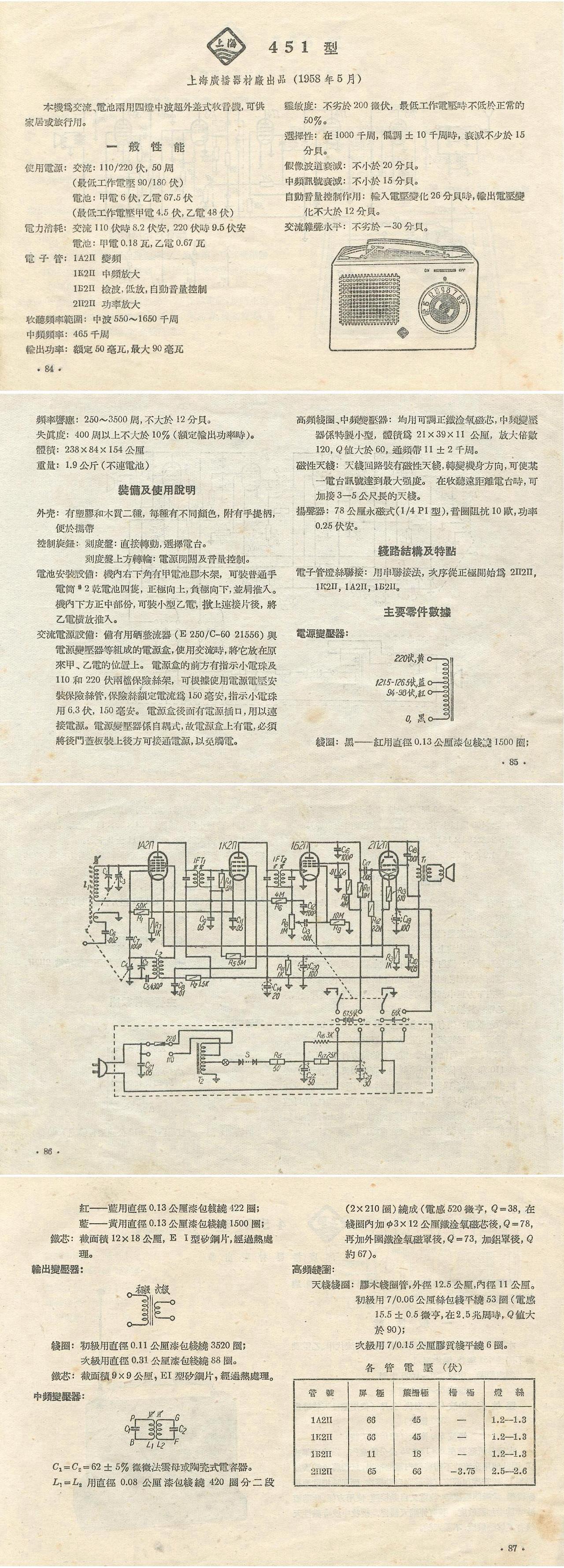 点击打开连接)网站介绍,上海451是在1957年2月——1958年研制成功作为国庆十周年献礼的;《人民日报》于1958年3月1日新产品介绍专栏发布了上海451试制成功并投产的消息;《无线电》杂志1958年4月号也介绍了上海451;1958年3月《无线电技术》(内部发行)创刊号封面刊登了雕花版上海451的大幅照片;而《国产广播收音机手册》一书介绍上海451生产日期是1958年5月,比此书更早出版的另一本小册子《广播收音机手册》(1958年7月出版,应是建国后第一本收音机线路图集)也有该机介绍,不过没有生产时间等信息。综上,基本可以推测:上海451可能是在1957年下半年试制了参展样机,1958年3月产品定型并试生产,1958年5月正式投产、推向市场。其间,产品外观、结构(尤其是塑壳的)都有比较明显的变化,详见下边的图片介绍。在1958年11月底召开的第一届全国收音机观摩评比会议上,451以其美观小巧的外壳设计,良好的高、低温和潮湿可靠性试验结果获得广泛好评,同时也被指出售价偏高。在1958年底到1959年初,上广电推出了451的升级产品452。至于上海451系列机到底生产到什么时候,总计生产了多少台,我就没有什么资料了。该机型现今的存世量不多,首先当时该机价格很贵(多处资料提及),远非一般人购买力可及,不会有很大产量,加之因体积小很易丢失损坏,多为野外作业人员选用,保存下来就更难了,于是造成了现在一机难求的局面。
