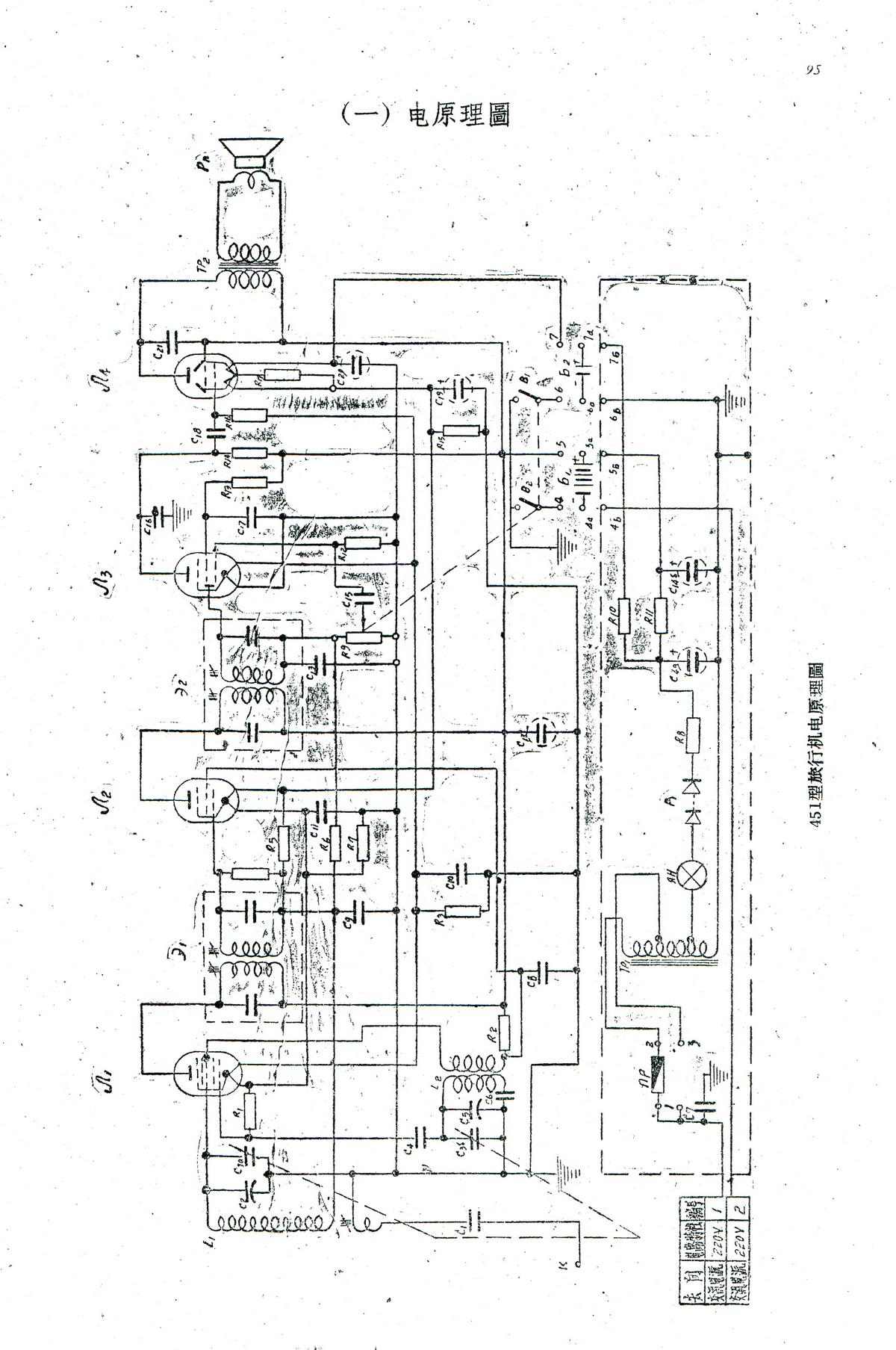 当然事物都是有两面性的,451也不是完美的,价格定位脱离市场购买力自不必说,机器的结构、电路设计也值得斟酌。最让人头痛的就是度盘了,与空气可变电容直接相连,没有缓动装置,调谐精度难以保证。如果说这是体积所限可以理解的话,那二者之间的连接如此松动就说不过去了,好不容易留存下来的451却鲜有带度盘的,不仅如此,度盘上还有小机关,一个可旋下的小盖虽然方便了更换里面的装饰片(不知材质,没见过实物),但又减少了一分可靠性,度盘留下来了,这个小盖丢失或严重划伤的却不在少数。看到这些便有骂当年结构设计者的冲动,我就是这方面的受害者。451由于是交、直流两用,当时技术条件下电路只能采用串联灯丝设计(两用机要求能够在交流市电和干电池上使用,一般电池式收音机的灯丝习惯上接成并联,而两用机就不能采用这种供电方式。原因是电池式收音机的灯丝只用甲电池供电,就没有考虑灯丝电流小的必要,而两用机除了用甲电池,还要能够用交流市电。用交流电供电时,丝压是直接由整流后的高压供始的,整流电流小,一般约70-80毫安,还不够灯丝并联后的消耗,而且整流后的高压还要作乙电,另须消耗约一部分电流。因此两用机的灯丝只能用串联的方式(《无线电》杂志的解释)。452有改观,虽然交直流两用但却是并联灯丝,原理尚未搞清楚,望高手指点),甲电需要4节2#电池,体积过于庞大,451的身材虽在国产机器中独领风骚,但与洋机比起来就逊色不少了,同期甚至更早的国外直流机品种繁多,体积小巧如后来的晶体管机器一般。451内部元件、结构设计基本沿用的是交流大电子管机的模式,复杂、笨重,拥挤不堪。交流电源盒也是粗笨的不得了,变压器未经隔离,自耦式设计有触电的危险。尽管451有这样那样的缺点,但却丝毫不能影响她在收音机爱好者心目中的神圣地位,瑕不掩瑜,爱屋及乌。我始终认为,论技术、讲工艺,国产机器都不值一提,喜欢国产老机,性能绝不能苛求!