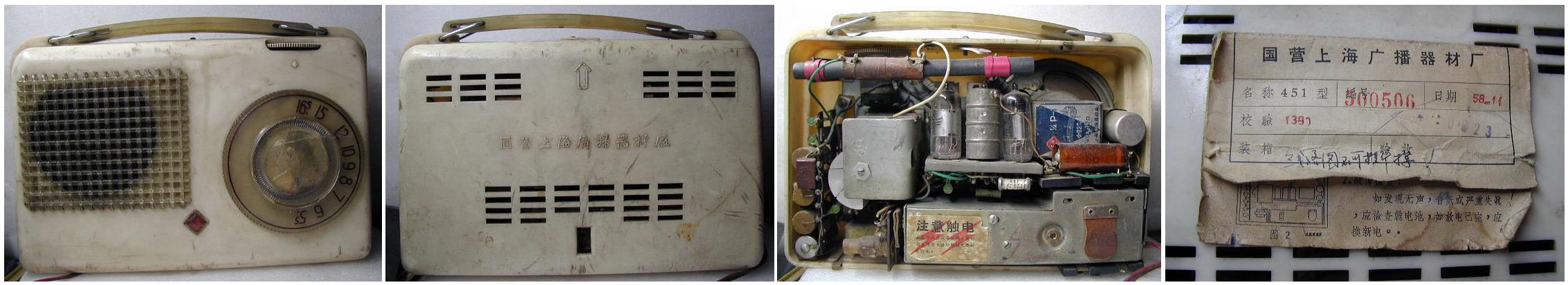 上海451型交流、电池两用手提式旅行收音机是我最喜欢的国产电子管收音机机型。我喜欢听电子管收音机的声音,那是与听晶体管收音机、集成电路收音机完全不同的感觉。然而囿于条件所限,实在没有空地摆放体积庞大的各式交流电子管收音机。于是,体积小巧的直流电子管机就成了最佳选择。