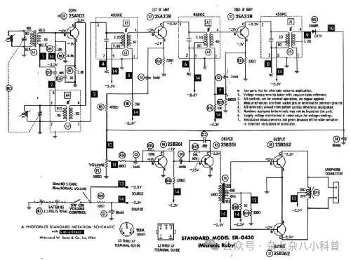 电路:超外差,6–11 晶体管,灵敏度、稳定性好。