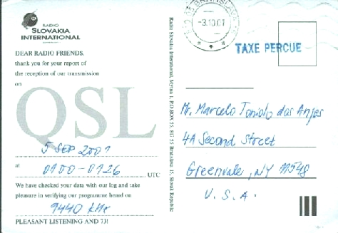 Radio Slovakia International 2002.11.20, 1910 UTC, 5915 kHz, Sobota, 250 kW 寄递日:03.10 - 03.19(实寄) 卡片图案:斯洛伐克雕版邮票