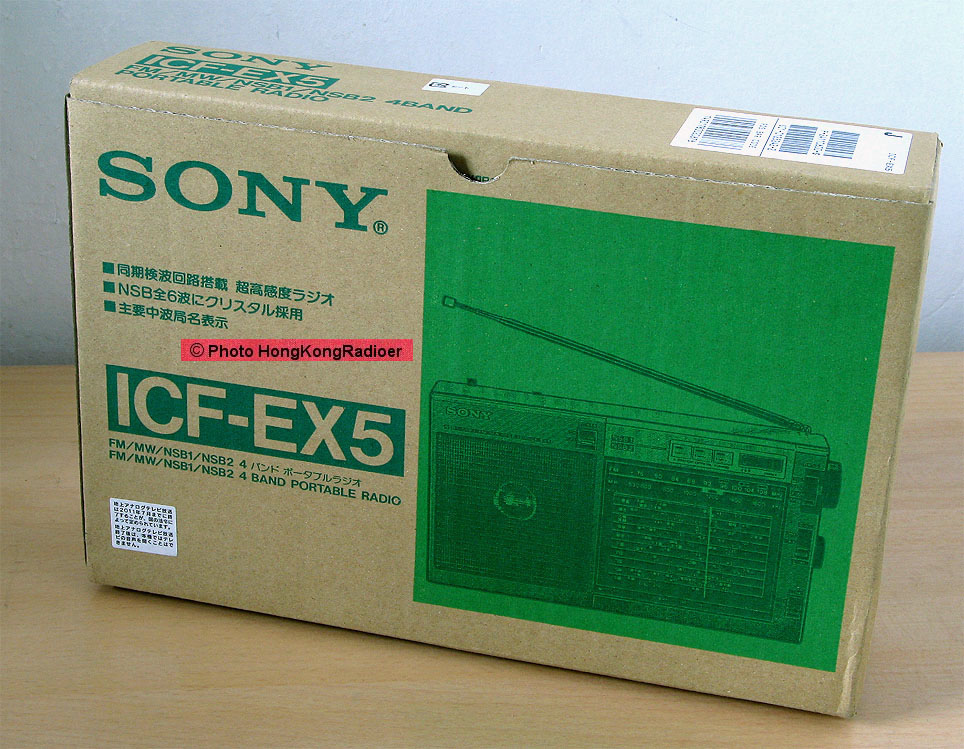 ICF-EX5 除了中波 (560 – 1605千赫) 和FM波段外,还有6个短波的晶体固定频率,有同步检波及SSB,备有天线信号强弱选择掣。没有时钟或响闹,可使用电池或直流电,机身上没手把,但原包装配置了肩带。