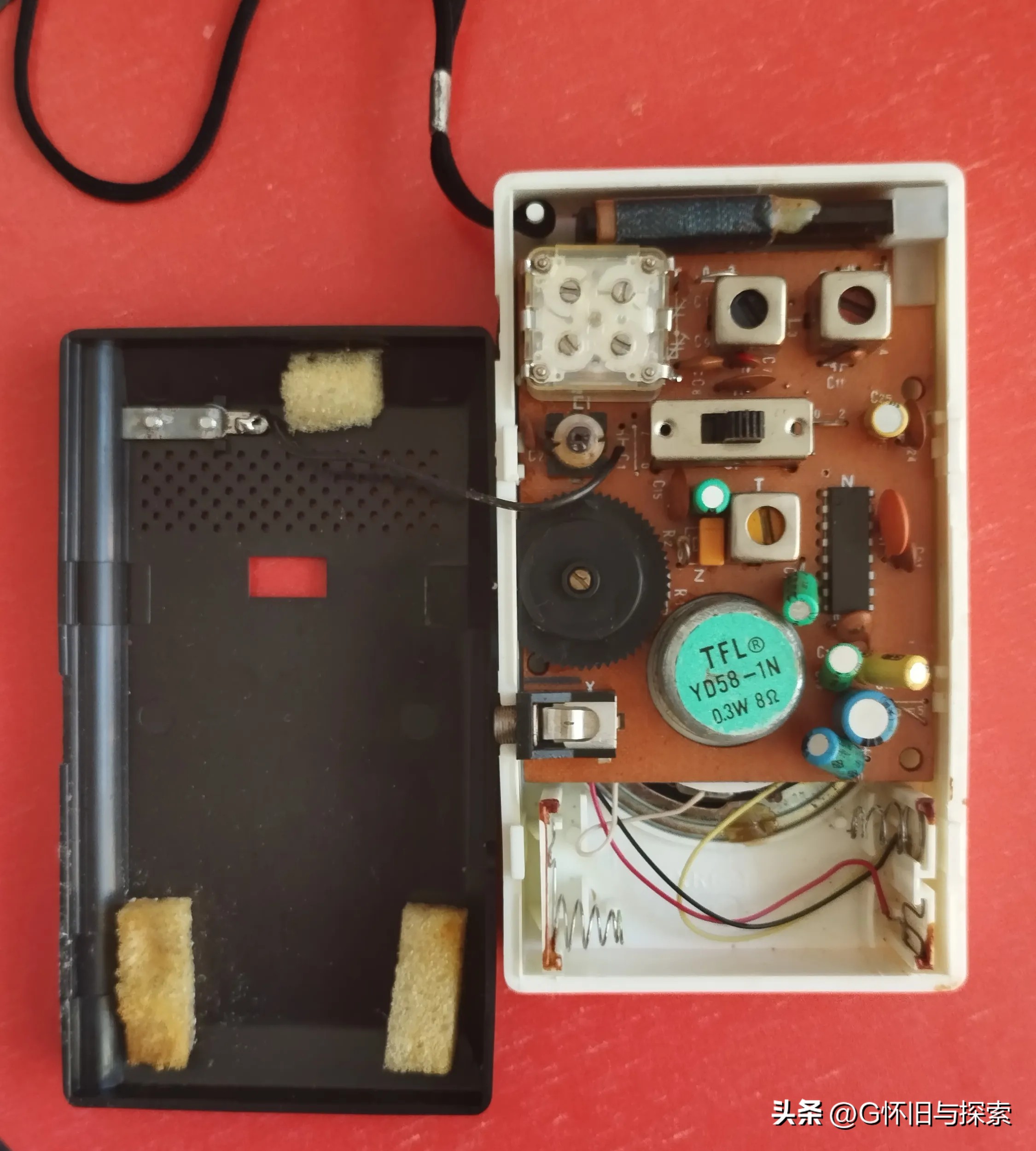 图4是牡丹牌MX112型两波段袖珍半导体收音机拆开后盖内部器件布局照。