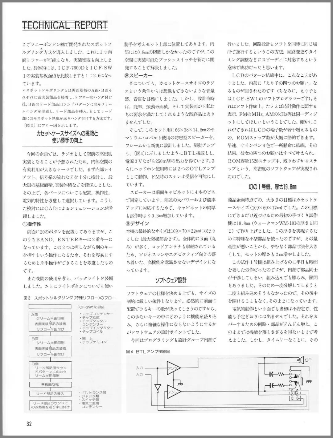 本机采用了索尼自主开发的“点焊式(Spot Soldering)”安装方式。通过这一方式,实现了双面回流焊成为可能,提高了安装密度。与 ICF-7600D 和 ICF-SW1 的安装基板面积相比,比例为 1:2.6