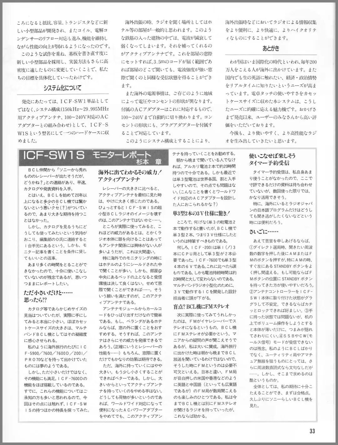 在发布时,我们并非将 ICF-SW1 作为单机销售,而是以系统配置(包含适用于 150kHz∼29.995MHz 的有源天线,以及支持 100∼240V 的电源适配器)的形式,将其命名为 ICF-SW1S 并收纳在一个硬壳手提箱中。