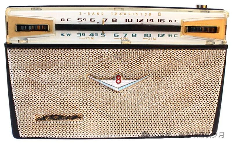 1964年“十·一”前上市的首批牡丹8402产品外观就有多种样式。最具有代表性的是当时报纸、杂志上所登载的版本(见图12):机壳正面上部是金属度盘,度盘中部标注频率处为黑底白字矩形方框,下部金属拉网中间嵌有红底白色景泰蓝牡丹花图形商标,金属拉网左下角缀有镶嵌珐琅的鎏金白底“牡丹”文字商标。这两个商标牌由北京电炭厂(原北京证章厂)精心设计制作,增强了整机造型的艺术装饰性,同时使之从外形上区别于夏普BX-327样机。这种样式的产品主要在1964年生产,1965年生产量很少。