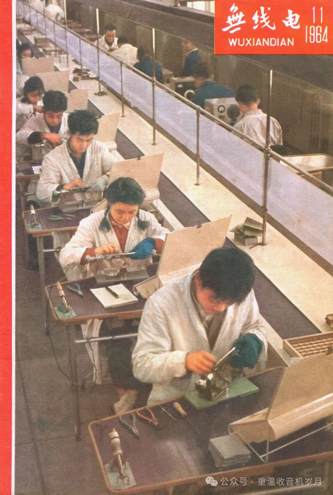 图1 北京无线电厂半导体收音机生产流水线(1964年第11期《无线电》封面)