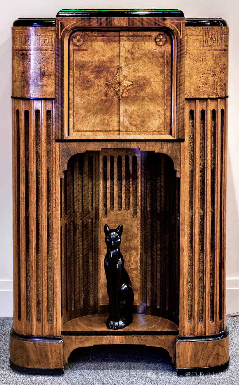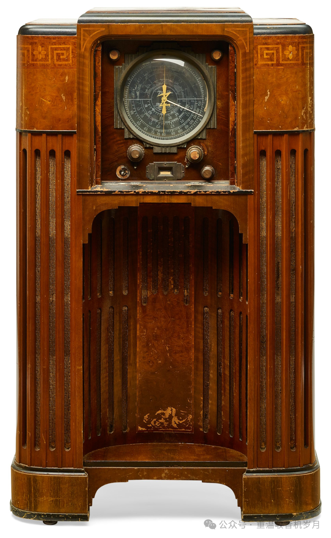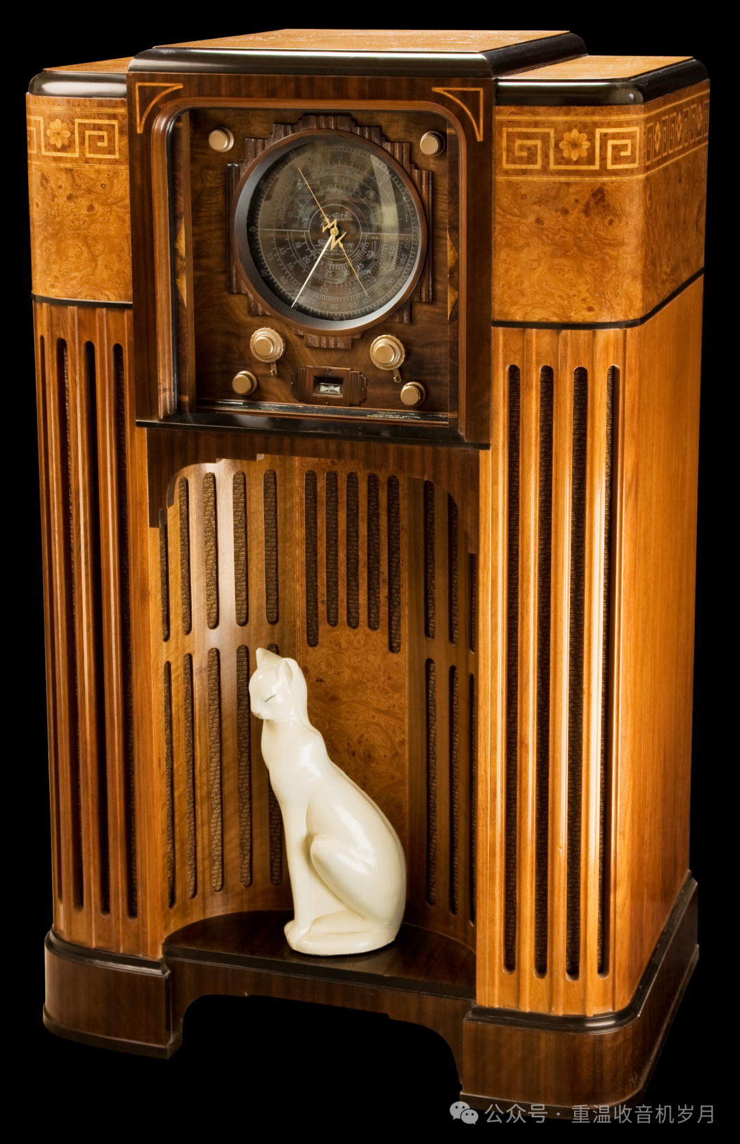上图所示的Zenith Stratosphere收音机,是近期于纽约市举办的收音机展上最亮眼的机型之一。这是一台配备 25 支真空管的机型,搭载一块由 29 盏灯照明的 10 英寸调谐度盘。机身内置3只扬声器,外壳采用树瘤胡桃木打造,并镶嵌了多种精选木材作为装饰。
