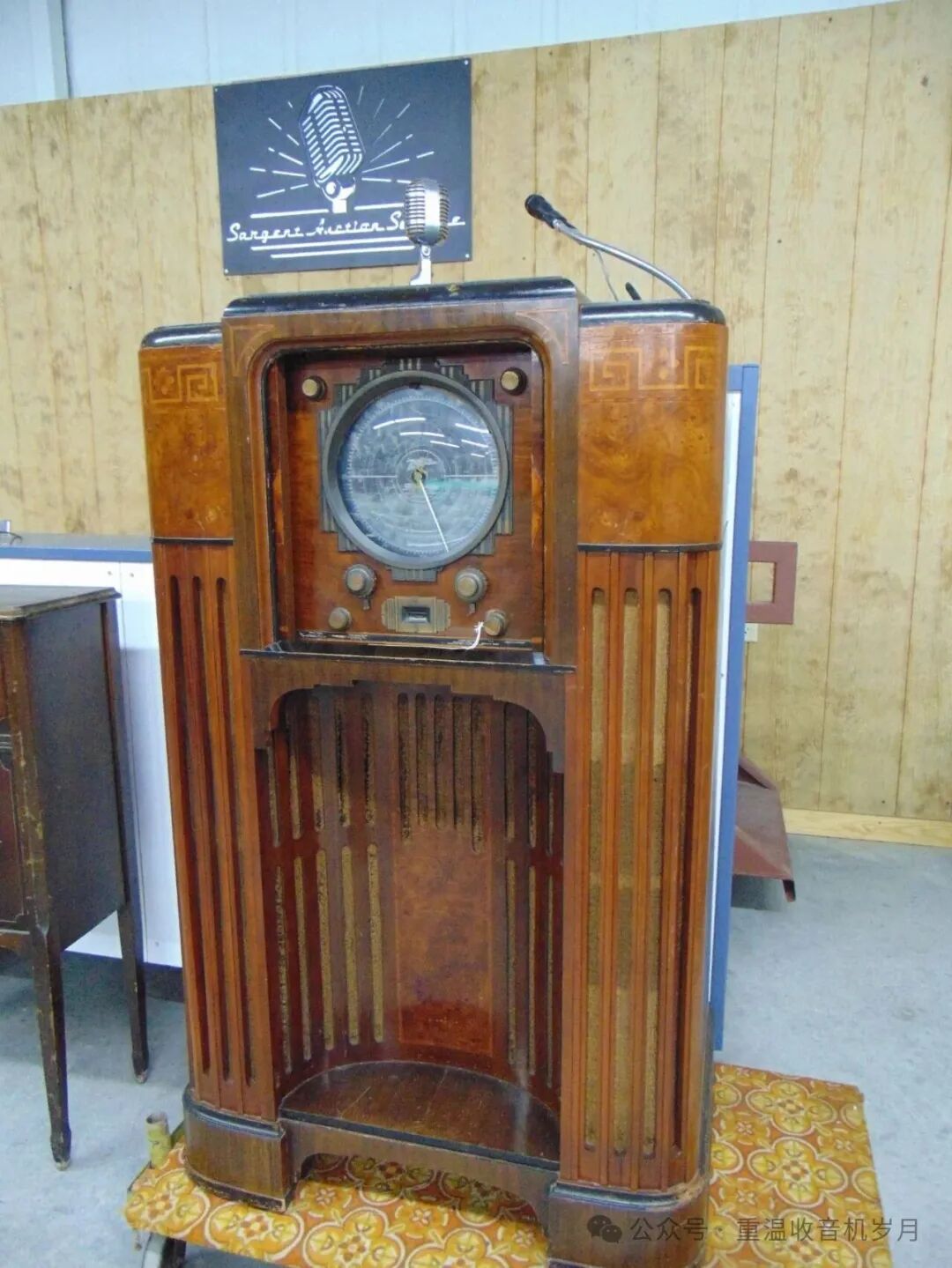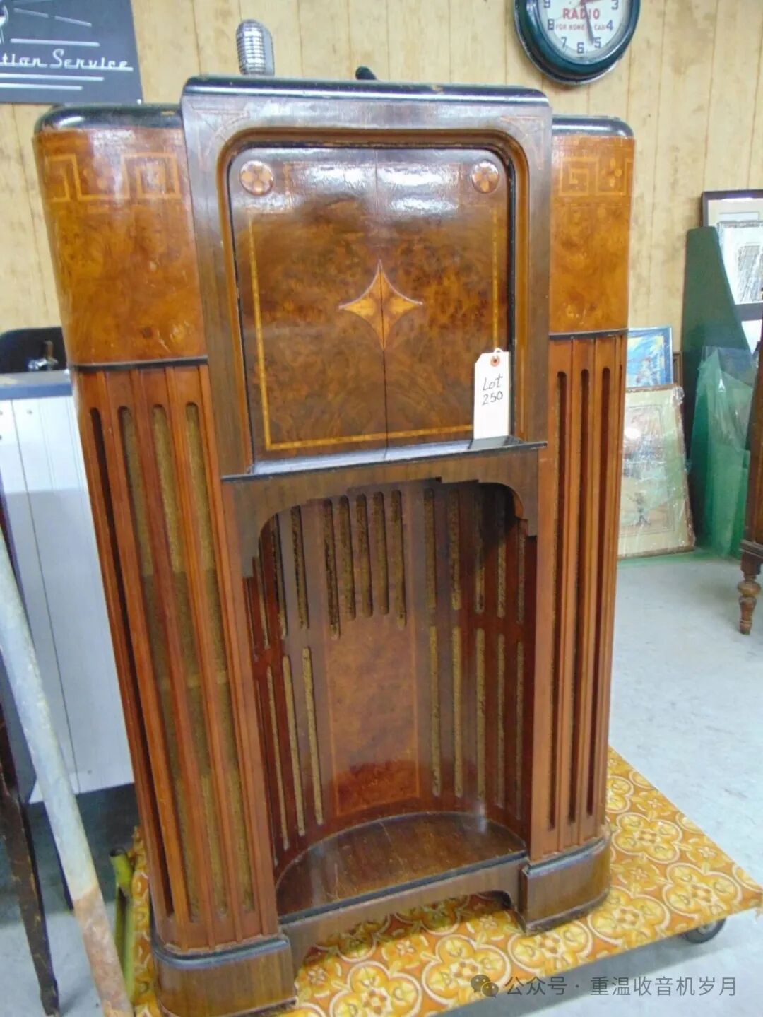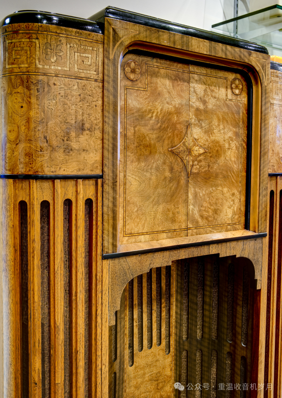 上图所示的Zenith Stratosphere收音机,是近期于纽约市举办的收音机展上最亮眼的机型之一。这是一台配备 25 支真空管的机型,搭载一块由 29 盏灯照明的 10 英寸调谐度盘。机身内置3只扬声器,外壳采用树瘤胡桃木打造,并镶嵌了多种精选木材作为装饰。