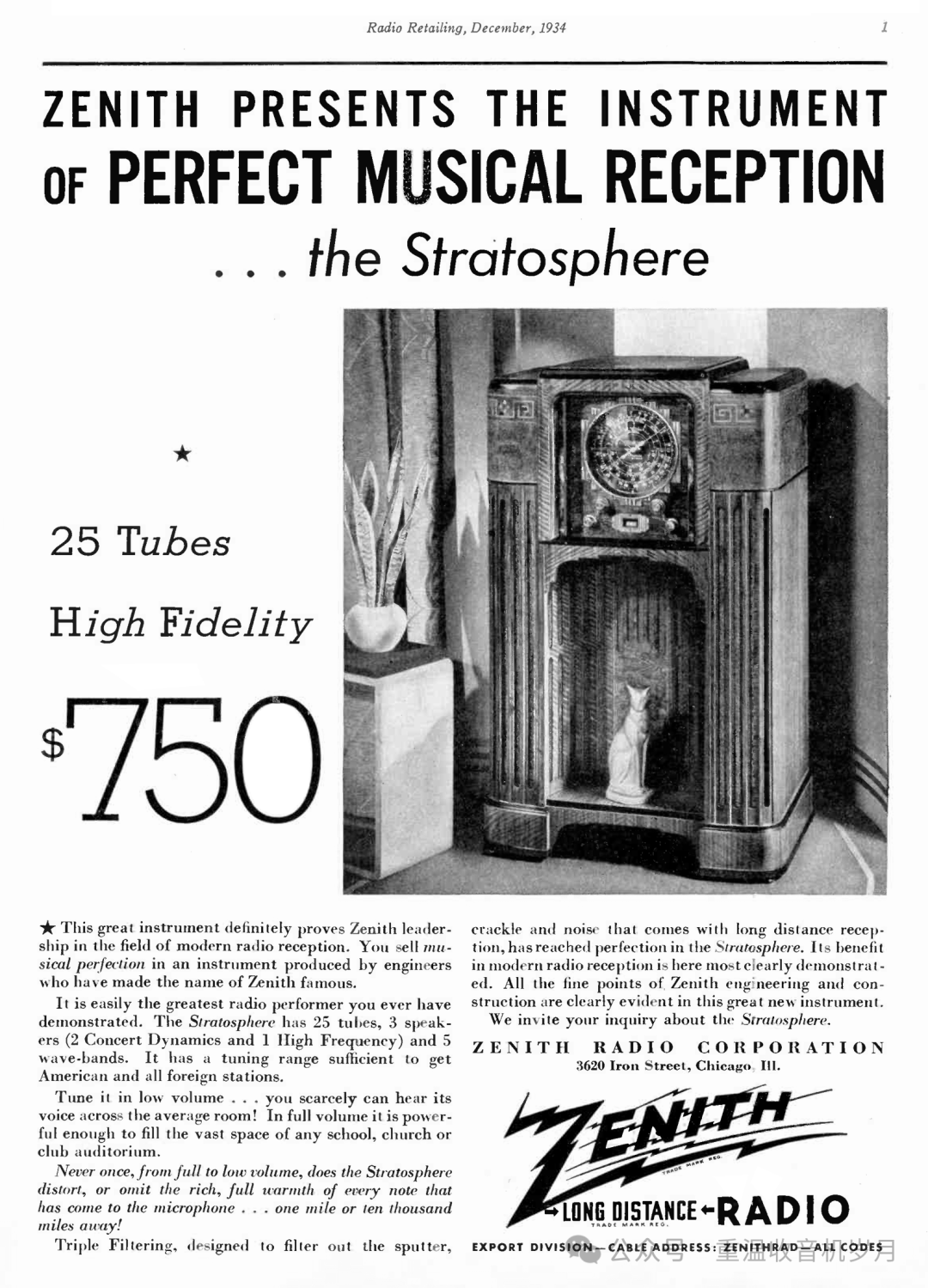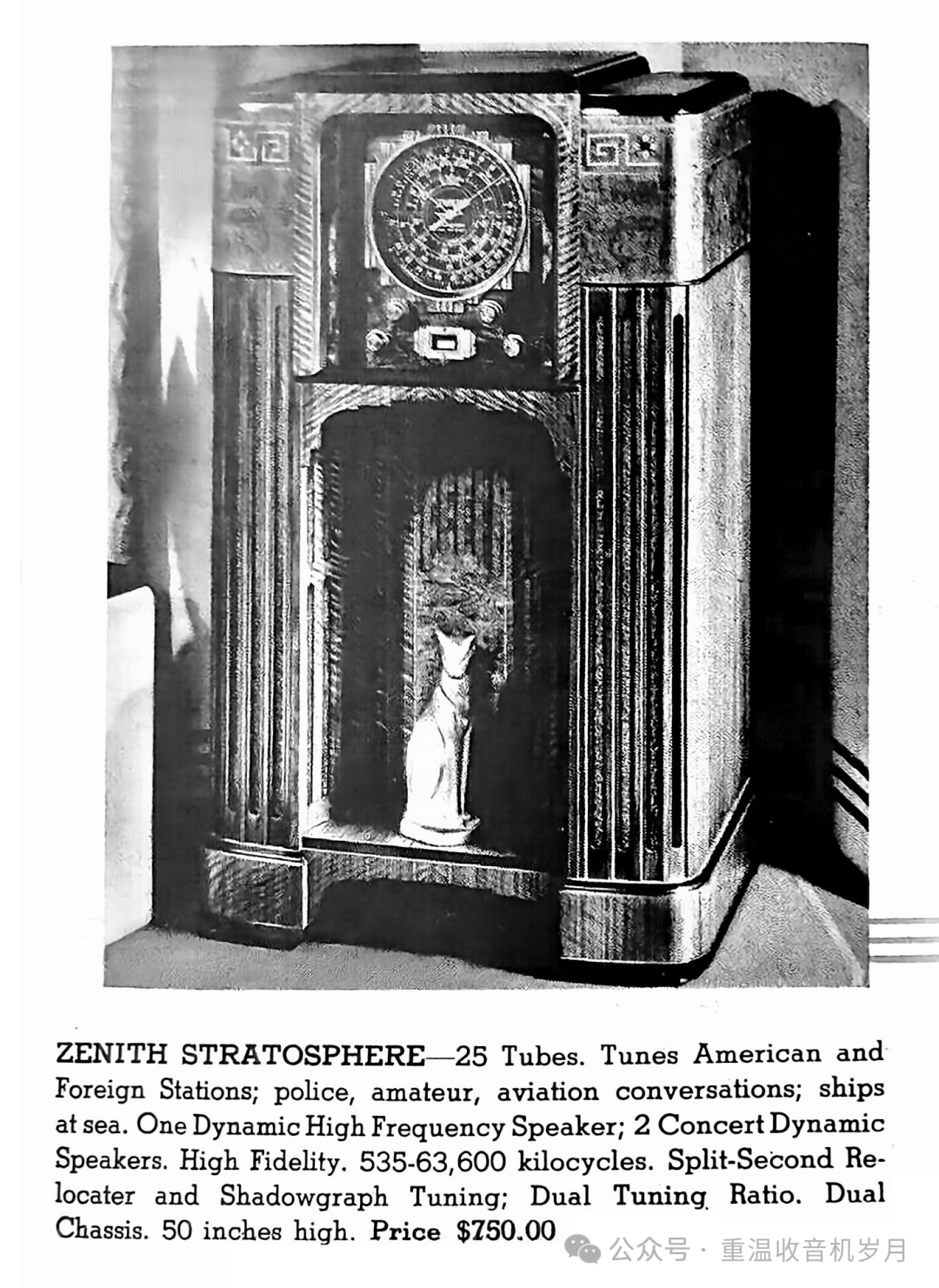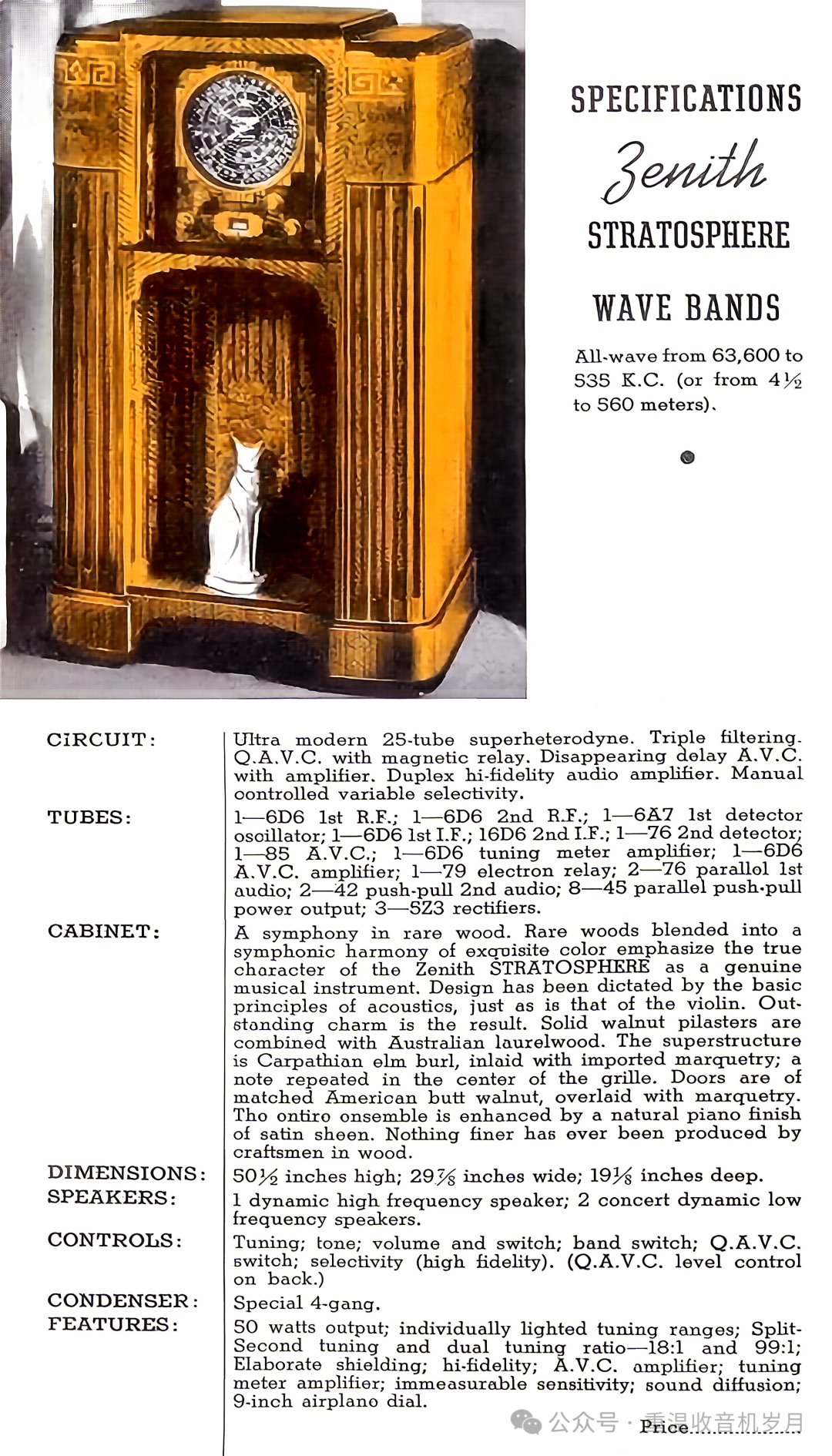 Musson 先生表示:“Stratosphere 无疑是你见过性能最出色的收音机。它配备 25 支真空管、3 个扬声器(两个大型音乐会扬声器 + 1 个高频扬声器),覆盖 5 个波段,调谐范围足以接收全美及所有海外电台。机身设计凝聚了 Zenith 的全部工程精髓,哪怕是普通用户,也能一眼看出它的出众品质。”