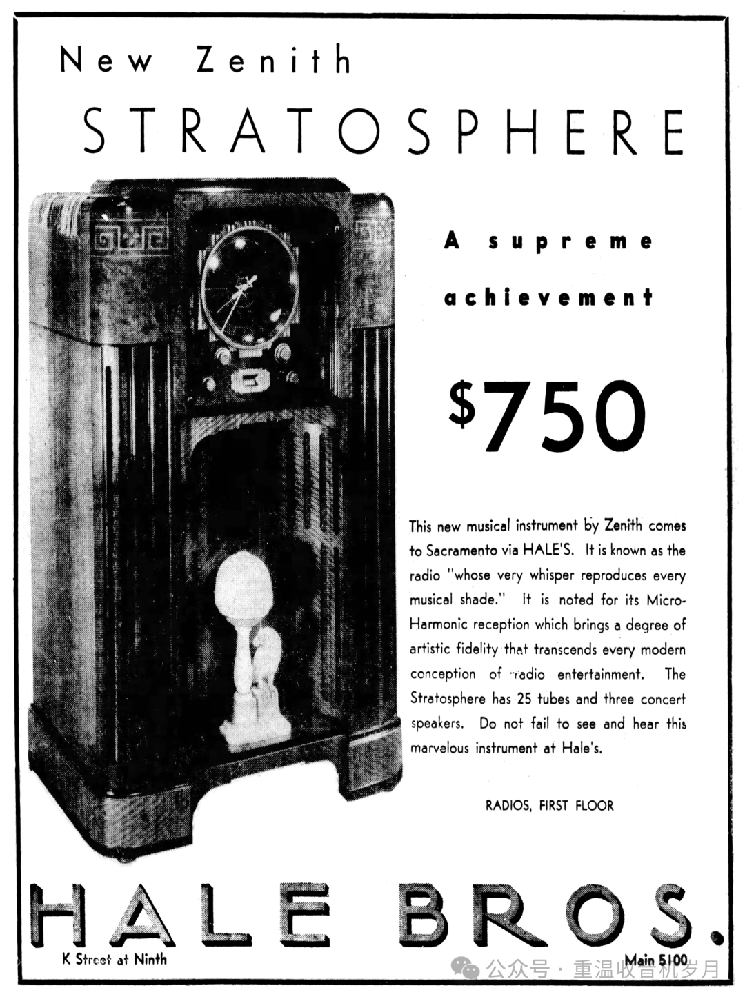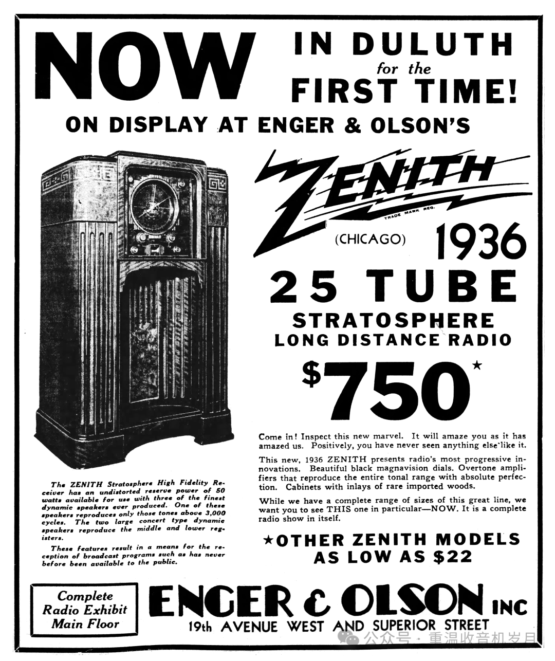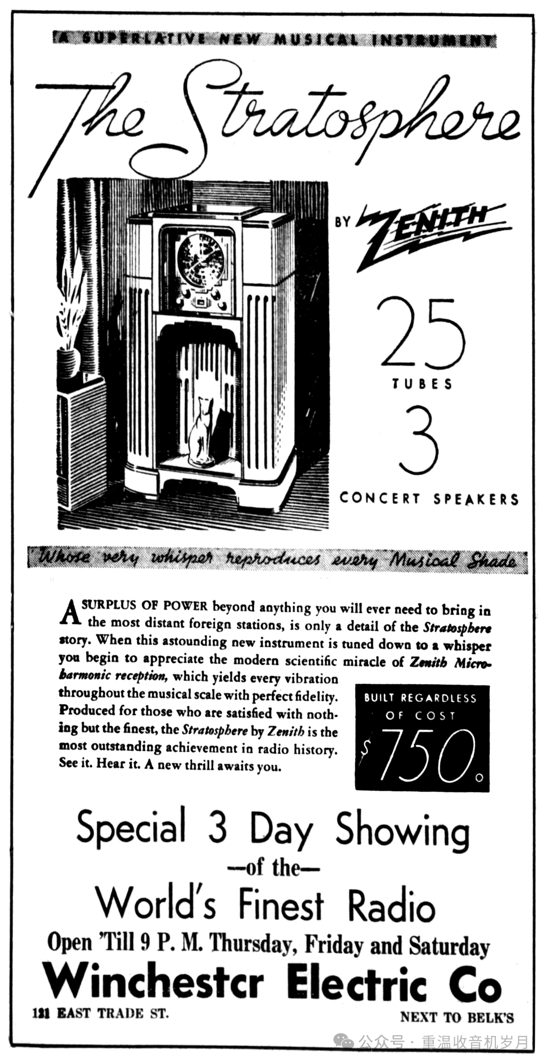 Musson 先生表示:“Stratosphere 无疑是你见过性能最出色的收音机。它配备 25 支真空管、3 个扬声器(两个大型音乐会扬声器 + 1 个高频扬声器),覆盖 5 个波段,调谐范围足以接收全美及所有海外电台。机身设计凝聚了 Zenith 的全部工程精髓,哪怕是普通用户,也能一眼看出它的出众品质。”