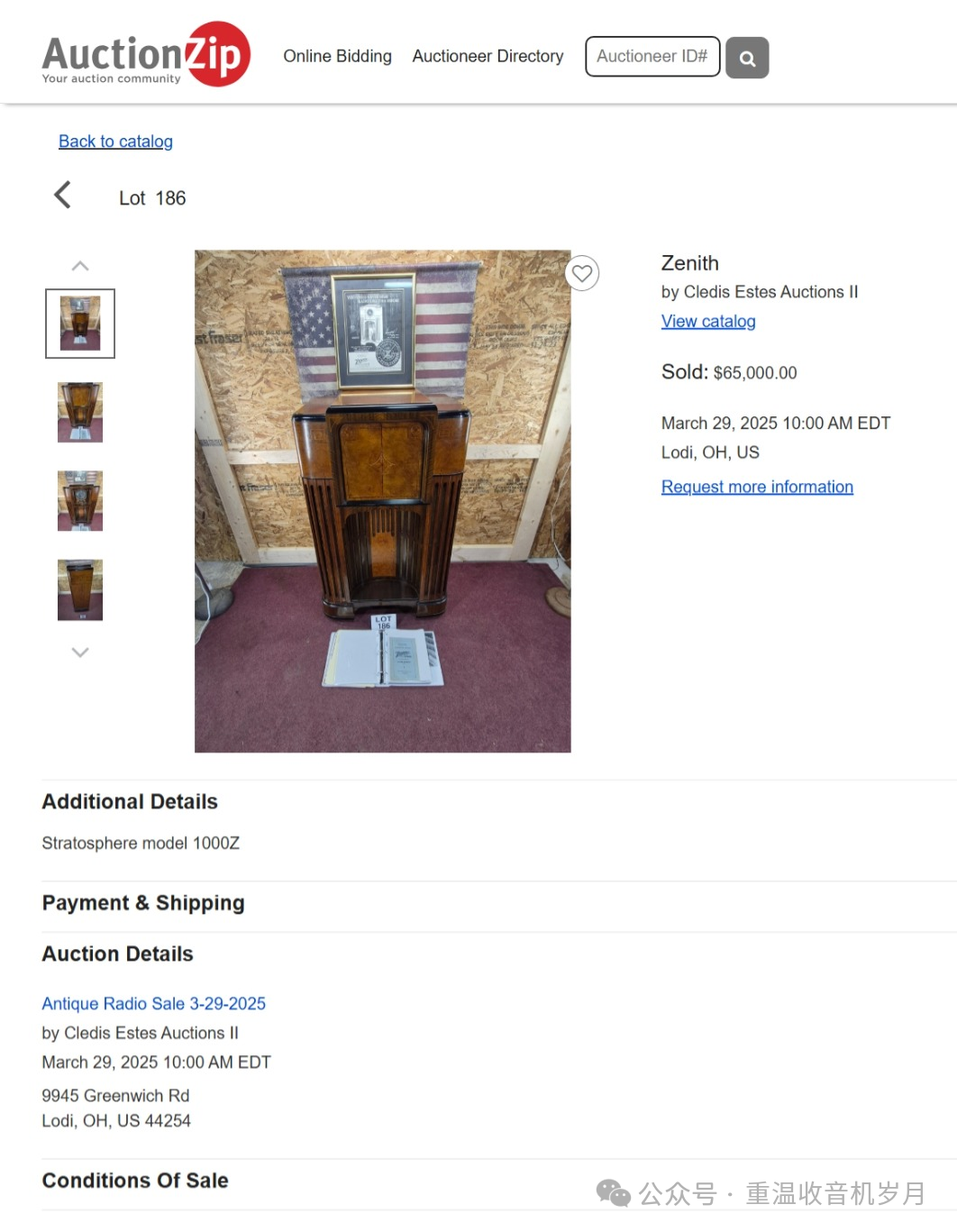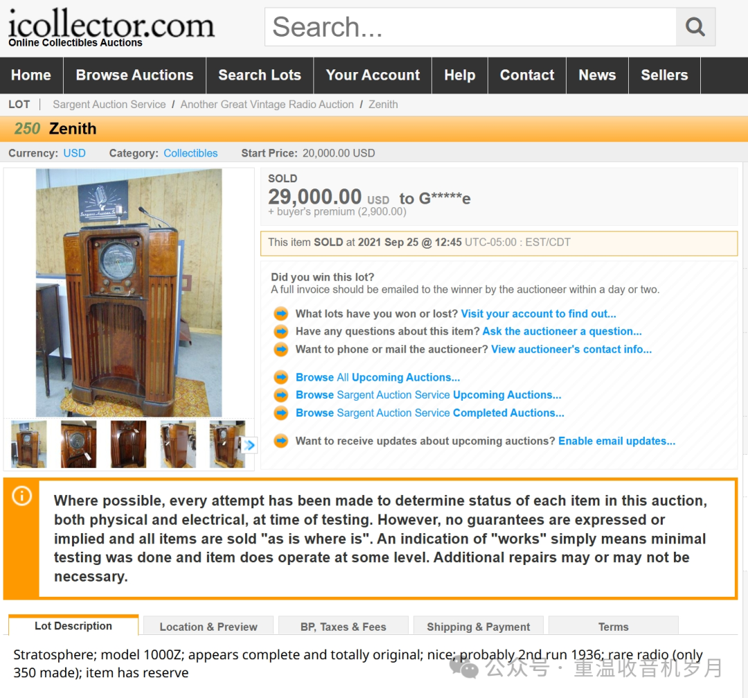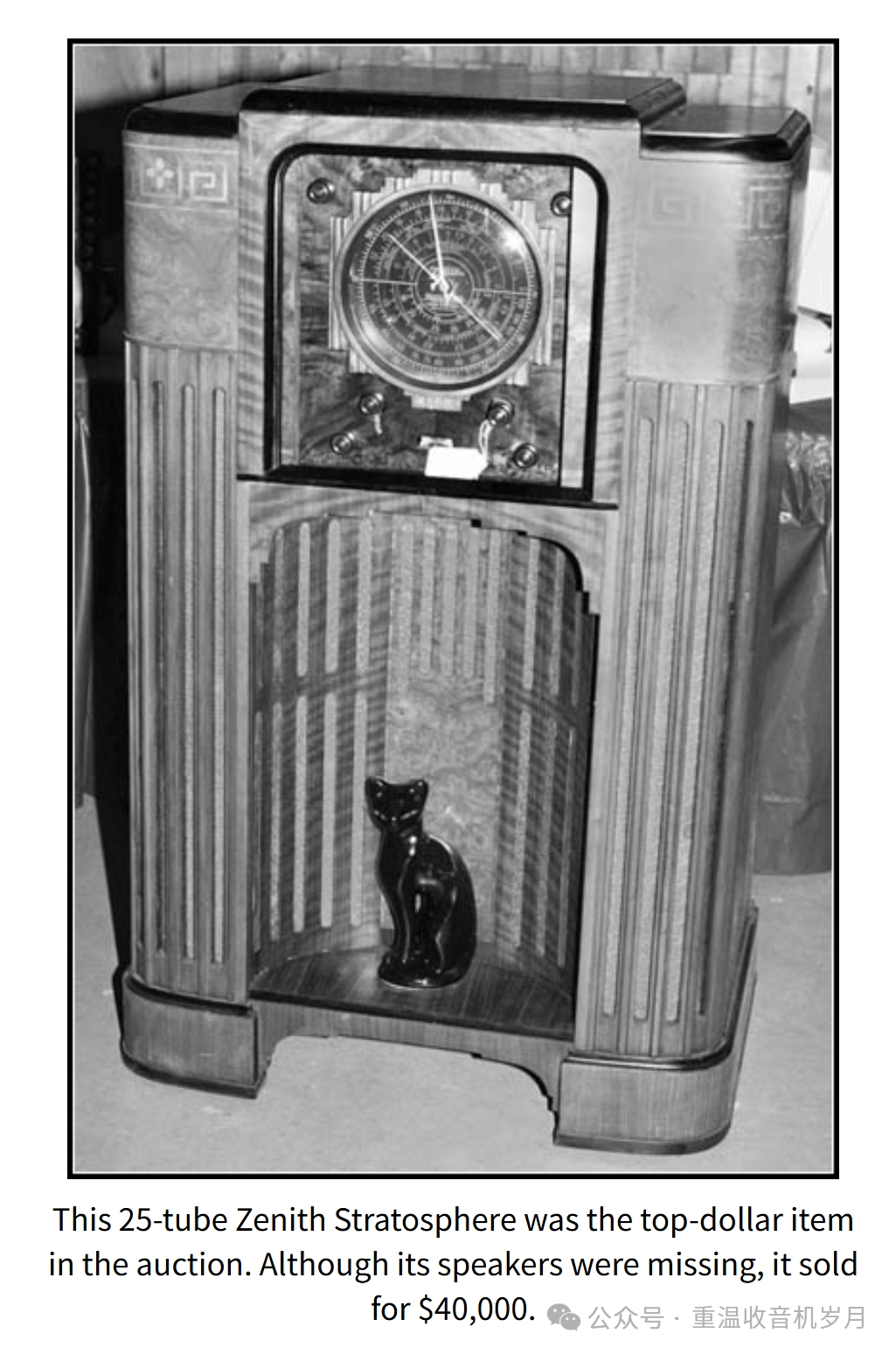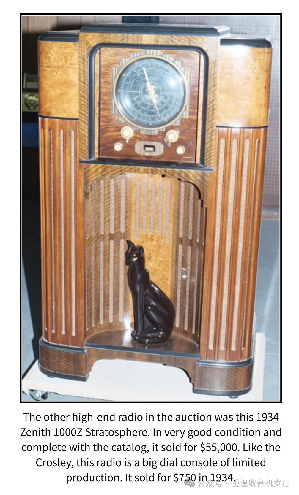 如今,以Stratosphere 1000Z为代表的Zenith高端收音机依旧在延续其传奇,被公认为是古董收音机收藏界最具价值、最受追捧的藏品之一,每一台1000Z的现身都会在拍卖市场上引发轰动,其已知的存世量仅有60台左右。1000Z集奢华的用料、强悍的设计、过剩的性能、精美的工艺和极度的稀缺性于一身,它不仅是一台收音机,更是大萧条时期美国工业设计与制造能力的丰碑。