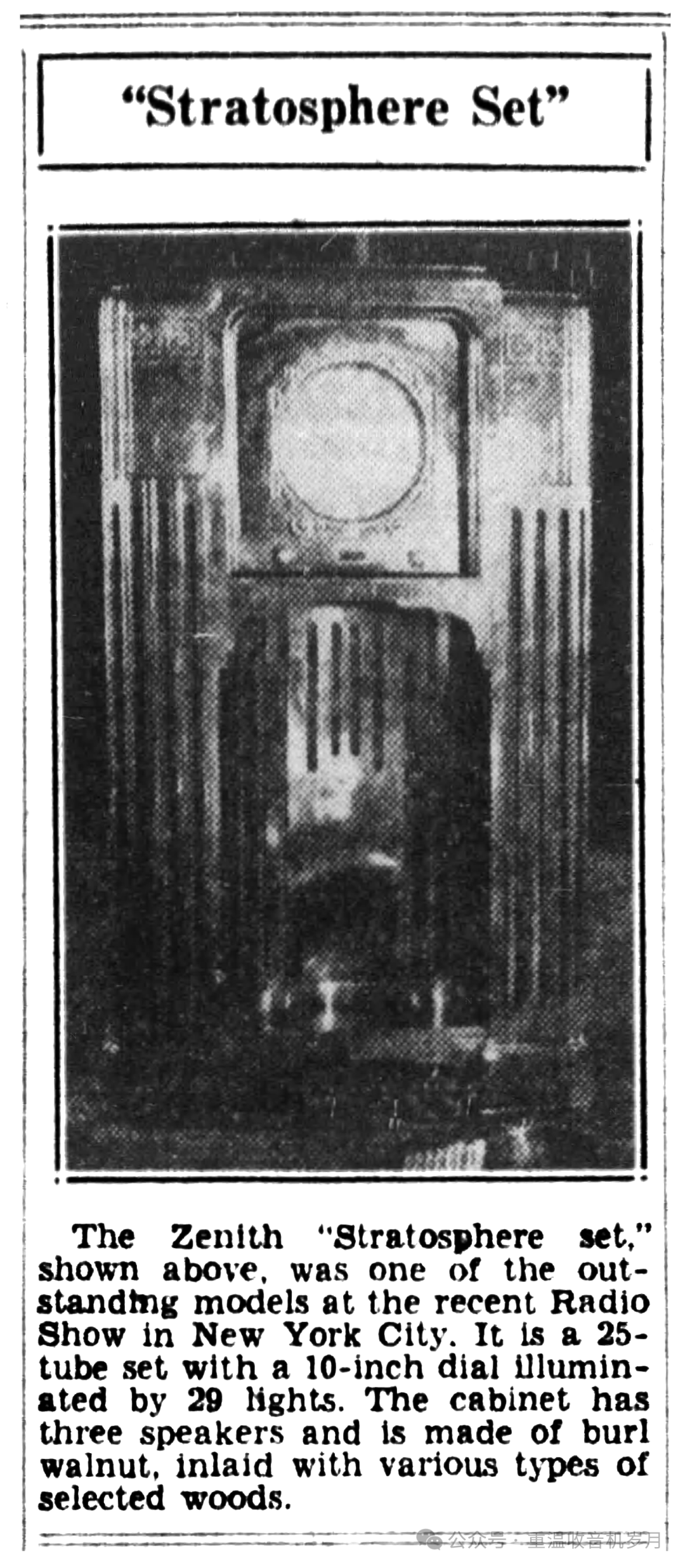 配有图片的Zenith Stratosphere收音机介绍,来自《Hartford Courant》1934年10月7日第47版。文字翻译: