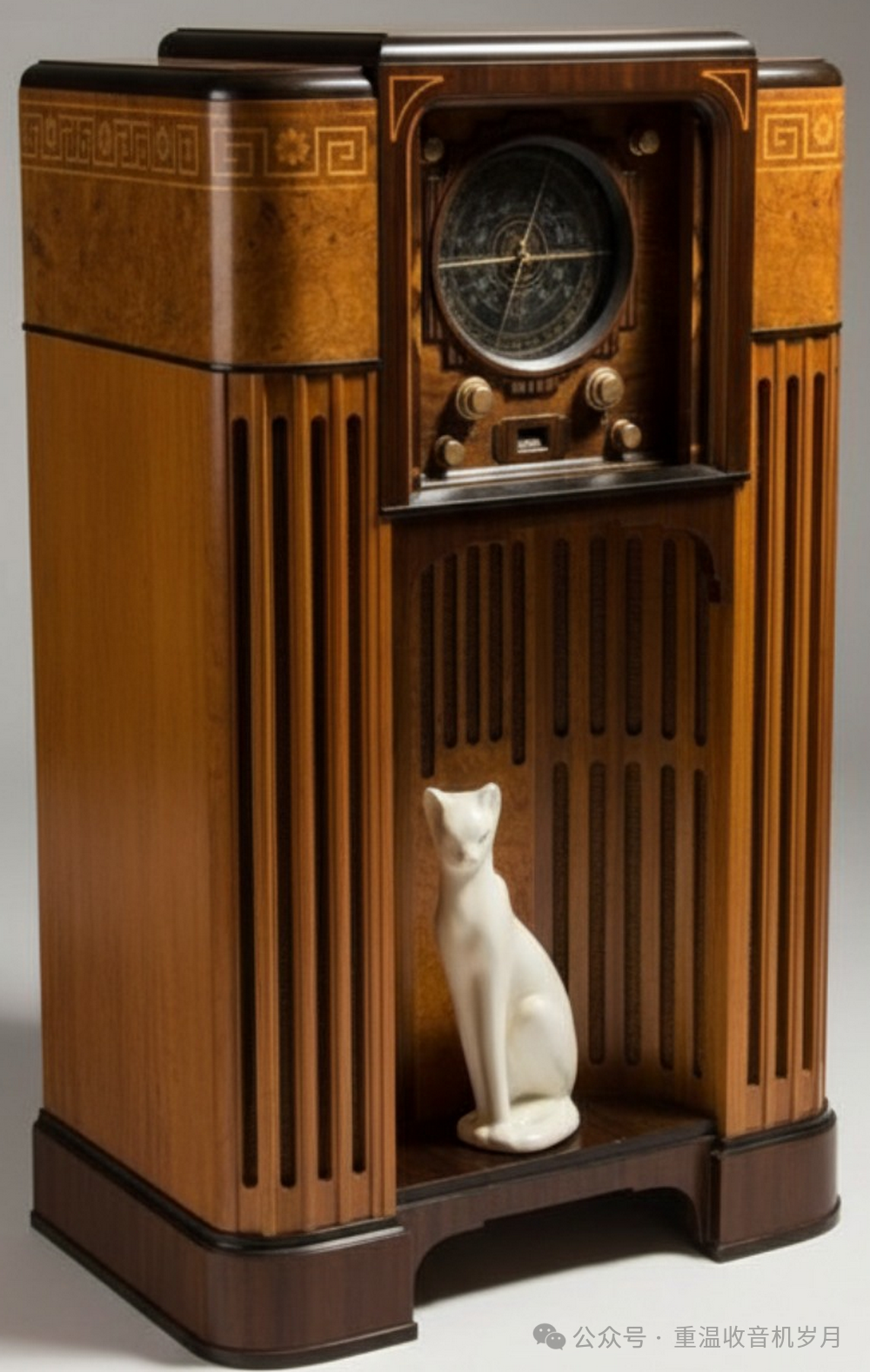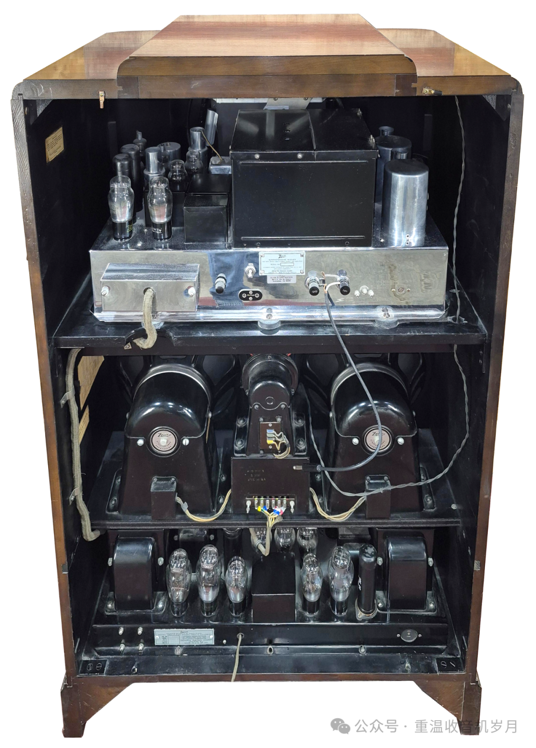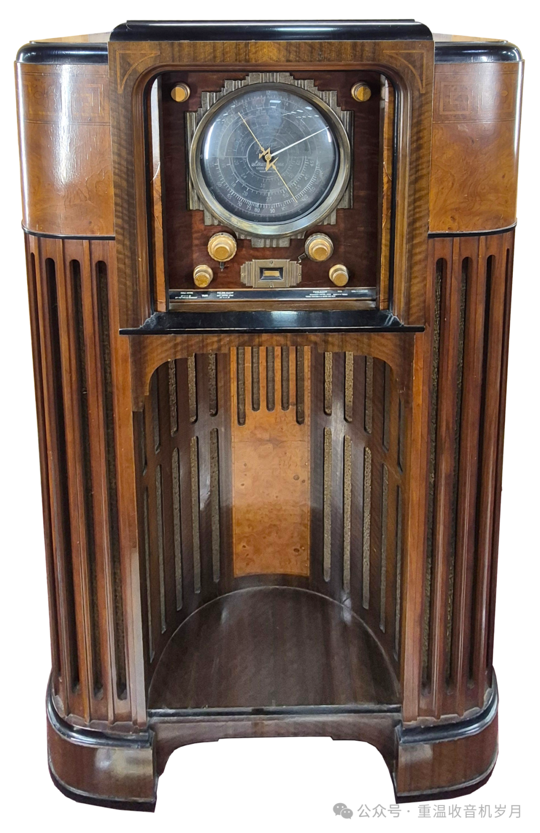 Stratosphere 1000Z型收音机代表了感性美学与理性技术的完美平衡。高达1.27米的装饰艺术风格摩天大楼式机箱由伊利诺伊州罗克福德市的著名家具设计师Frank Issac Johnson设计并申请了外观专利,使用珍稀的核桃木与澳大利亚月桂木拼花,工艺精美绝伦,设计完全遵循声学基本原理,如同小提琴一般气质非凡。整机重约325磅(约147.4千克),采用分体式镀铬底盘设计,上半部分是收音调谐器和控制电路,下半部分是巨大的供电电源和功率放大器。25个真空管的奢华配置惊艳业界,其中功放搭载8个推挽式真空管输出50瓦的强劲功率,驱动两个巨大的12英寸低音扬声器和一个6英寸高音号角扬声器,加上精妙繁复的电路设计,让它能呈现出同时代其他收音机都无法企及的堪比影院音响系统的低频响应效果,助其率先抢占了高保真市场。该机型的频率接收范围宽至535千赫至63.6兆赫(第二批产品调整为45兆赫),分为5个波段,远距离接收性能优异。其最迷人之处在于那块10英寸(约合 25.4 厘米)大的黑色圆形调谐度盘,6块特制的玻璃配有复杂的背光照明,多达14个指示灯,能够清晰显示不同波段的频率,宛如夜航飞机的仪表盘,神秘而深邃,很快成为其他制造商纷纷效仿的对象。