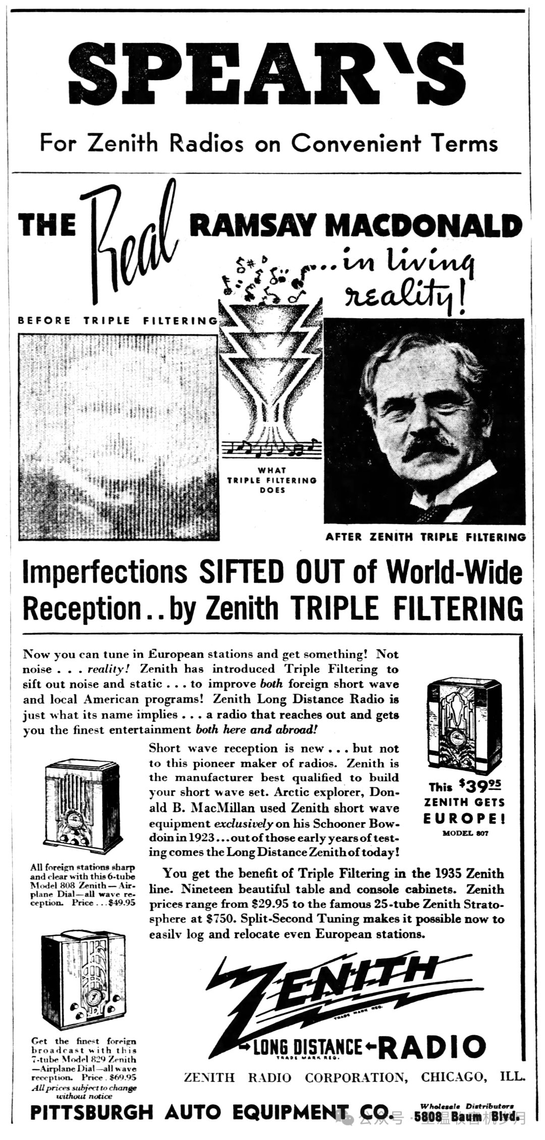 提及Zenith售价750美元的Stratosphere型号 25 真空管收音机的广告,来自《The Pittsburgh Press》1934年9月20日第19版。
