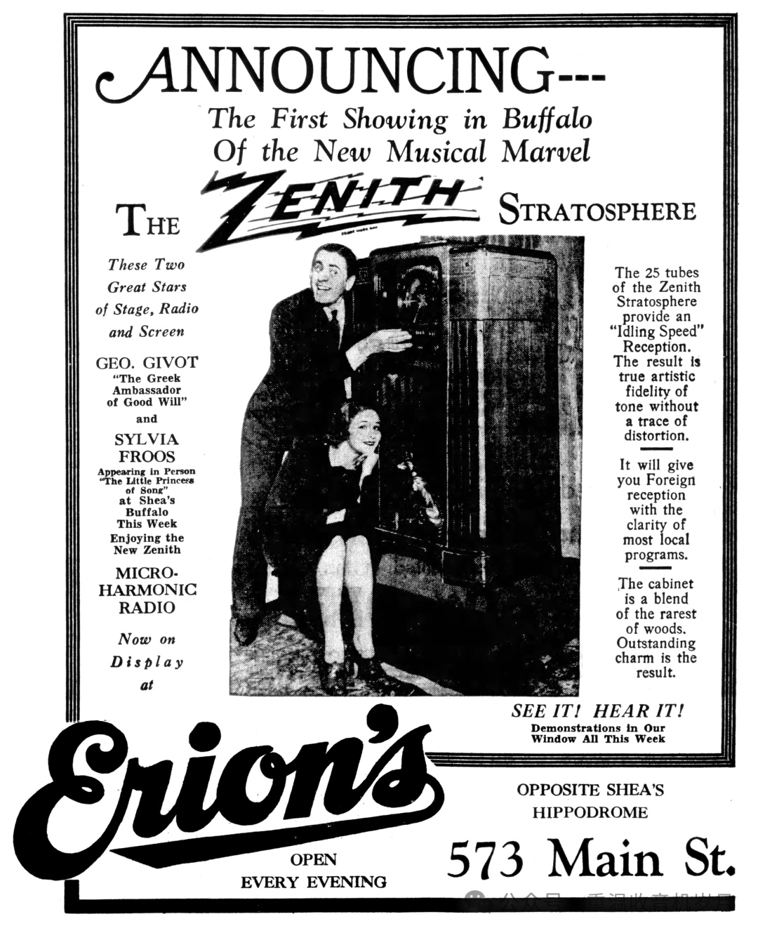 25管Zenith Stratosphere广告,图中两位舞台、广播与银幕明星George Givot与Sylvia Froos正在体验全新的Zenith Stratosphere收音机。来自《The_Buffalo_Times》1935年1月20日第9版。