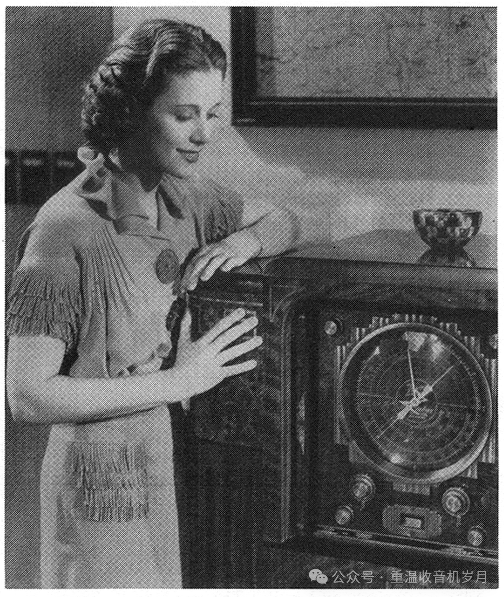 1935 年推出的一项极具市场吸引力的卖点,就是这种 “大型黑色调谐度盘”。图中演员Irene Hervey身旁的,就是一台搭载了该度盘的巨型Stratosphere 收音机。来自《the Zenith Story》。