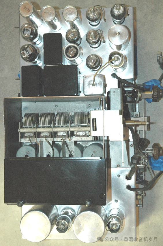 该机采用双底盘设计:上方底盘包含所有射频、中频电路,以及除功率输出级、自动音量控制电路、“Q” 值电路和特殊音频补偿电路之外的音频电路;下方底盘则装有功率输出级,以及两套独立完整的电源电路。