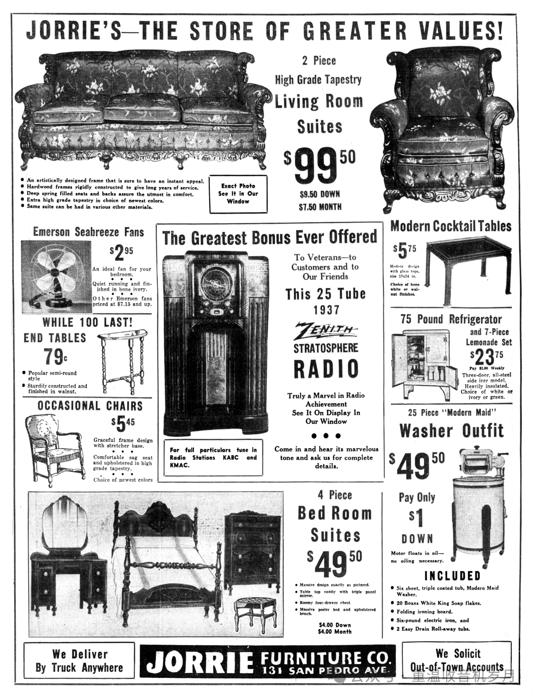 家具广告中的Zenith Stratosphere收音机,来自《San Antonio Light》1936年6月7日第19版。