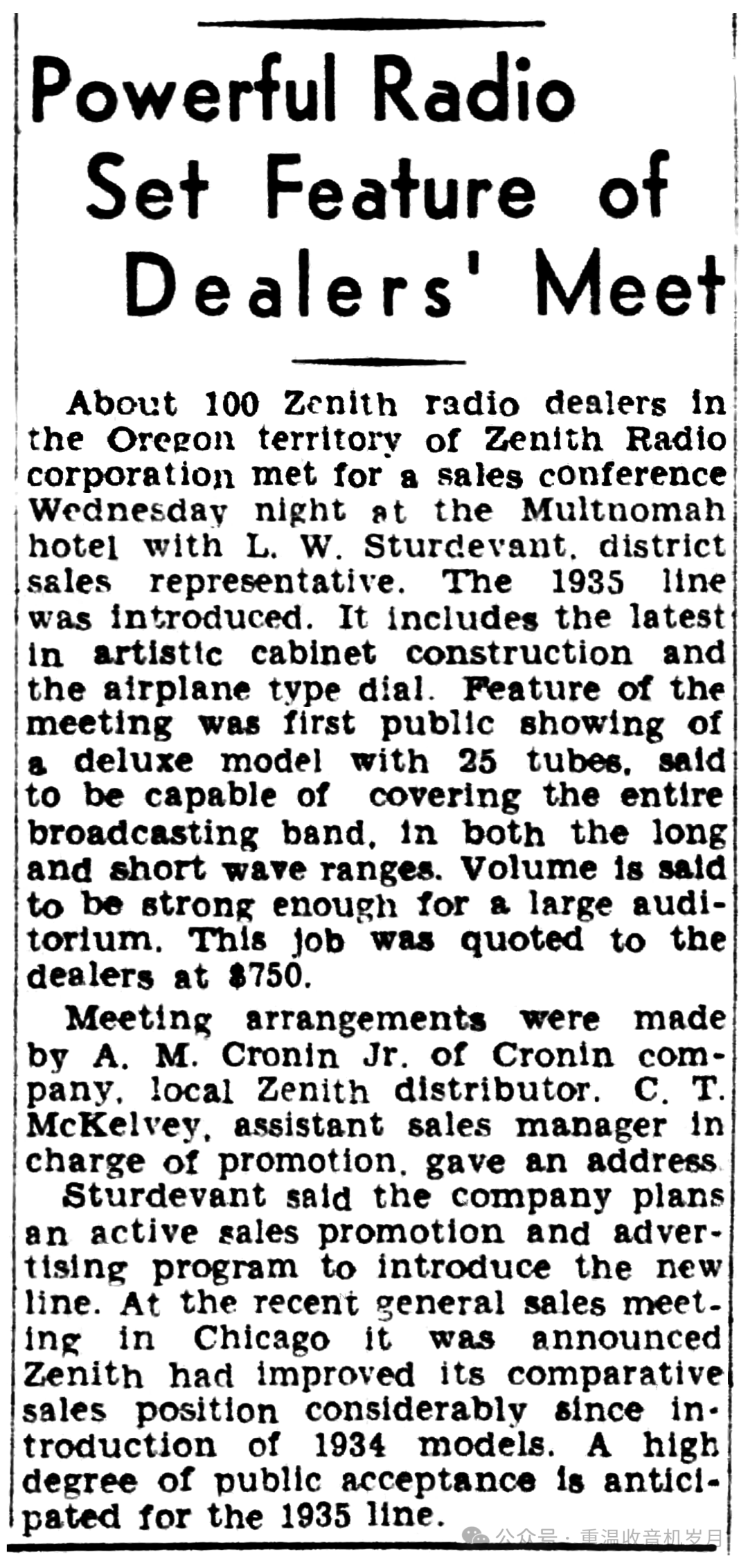 Zenith无线电公司旗下 Oregon 地区约 100 名 Zenith 收音机经销商,于周三晚在 Multnomah酒店,与区域销售代表 L. W. Sturdevant 共同召开销售会议。