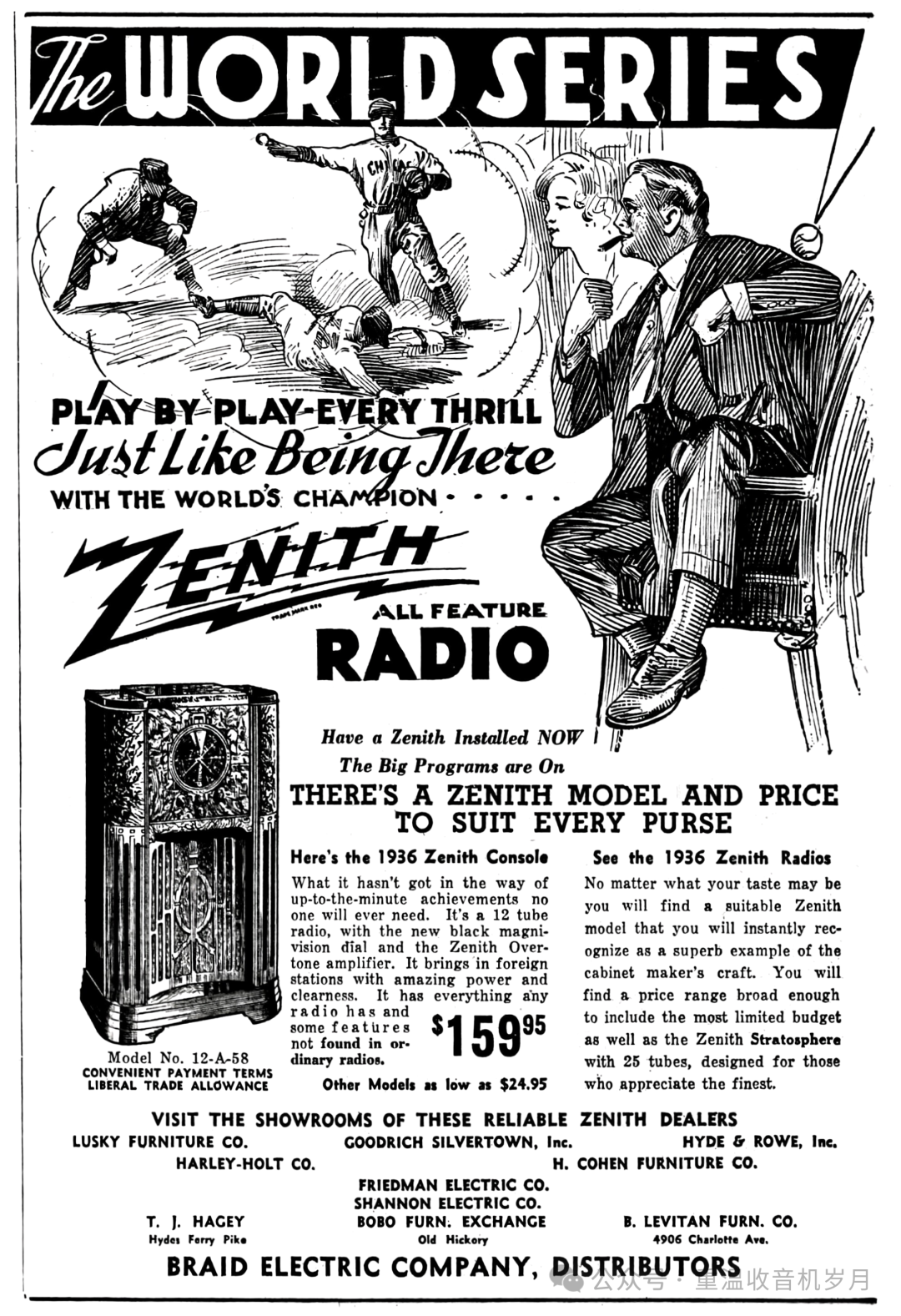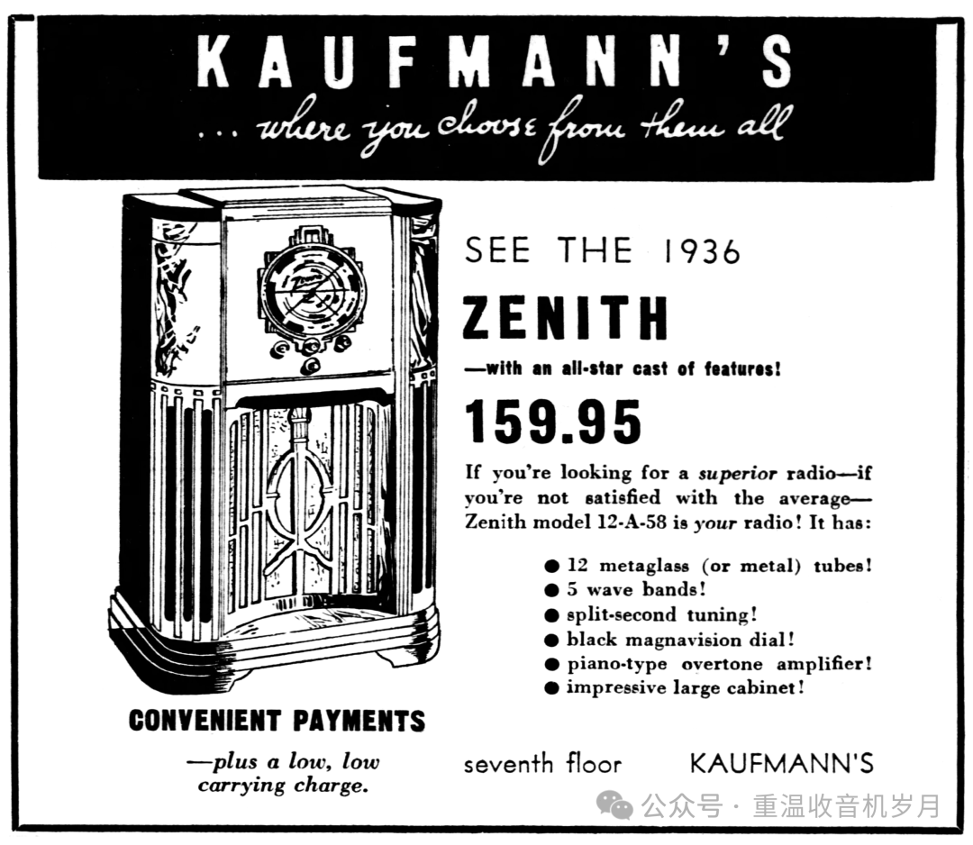 Zenith 12-A-58广告,来自《The Pittsburgh Press》1935年10月15日第28版。