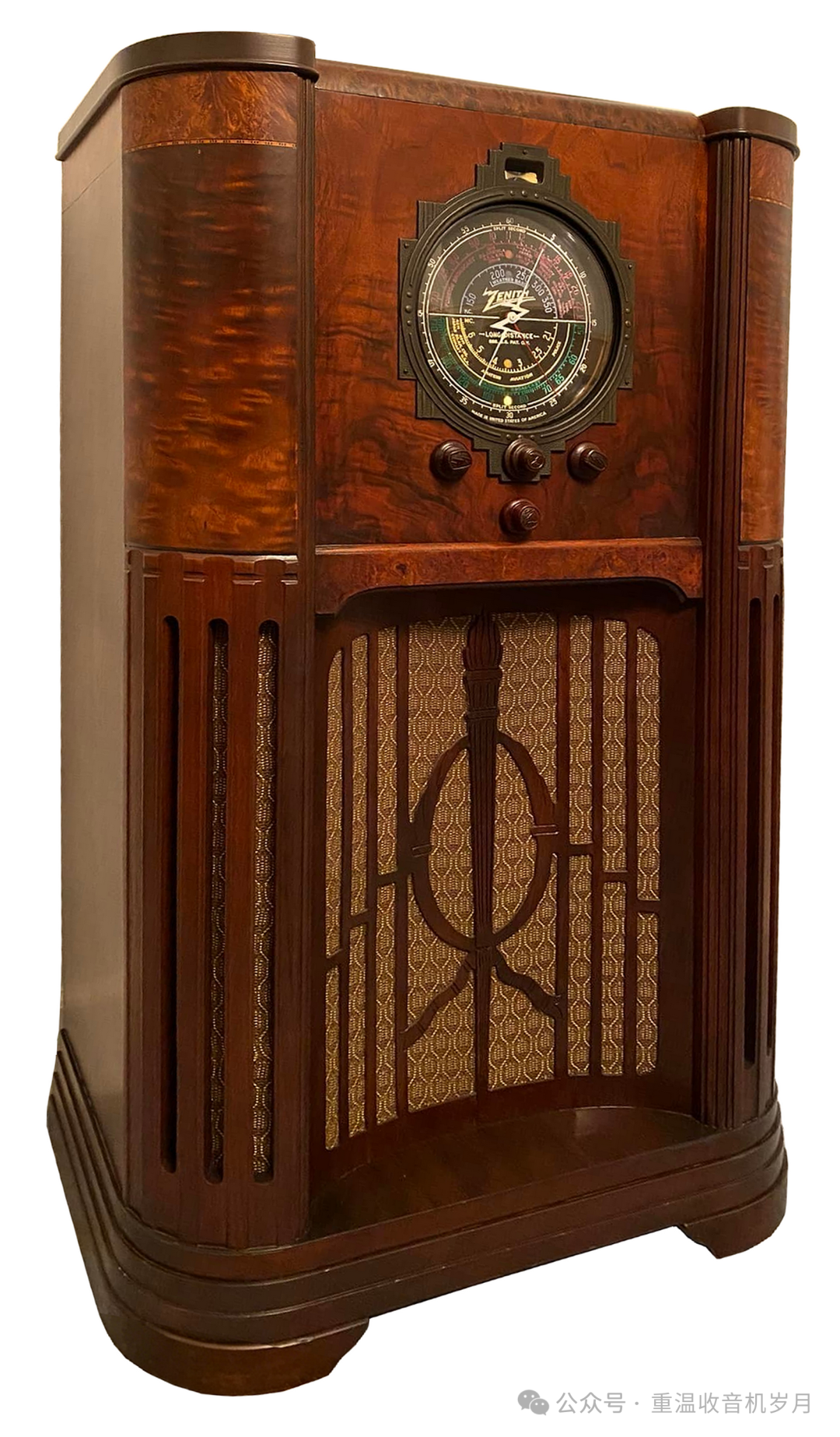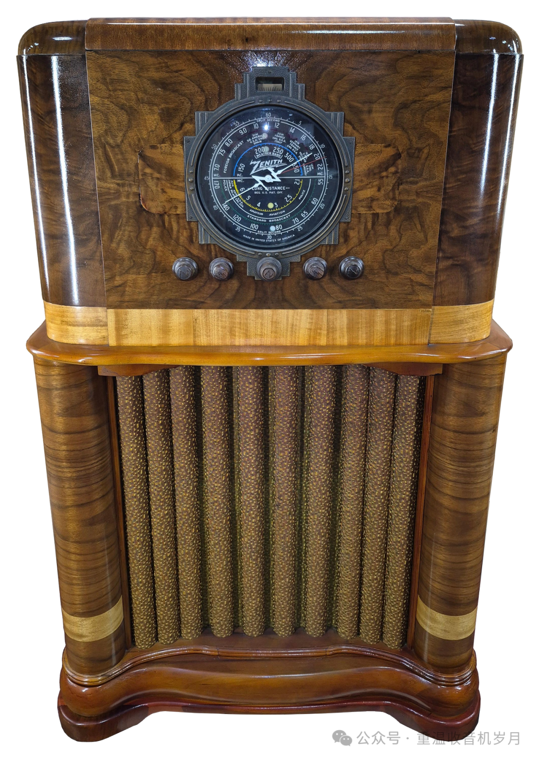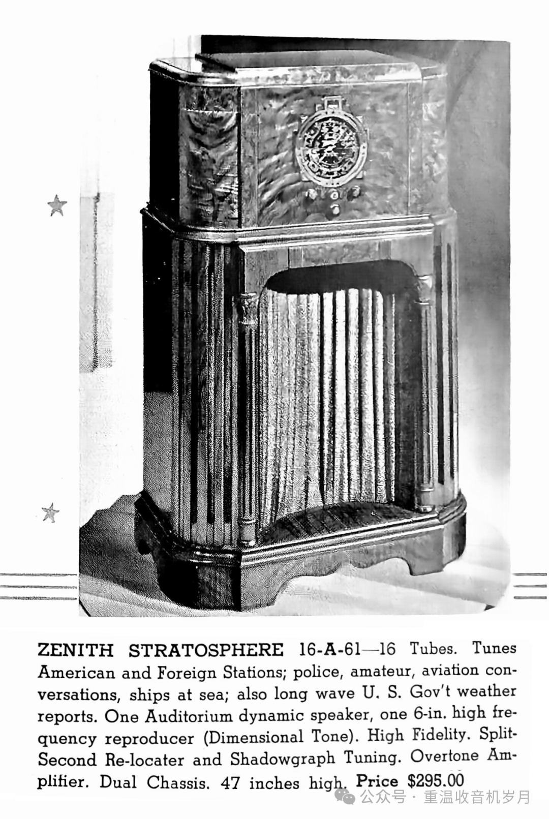 ZENITH STRATOSPHERE 16-A-61 型 —— 16 真空管。可接收美国及海外电台;警用、业余无线电、航空通话、海上船舶电台;同时可接收长波波段美国政府气象报告。1 只礼堂级动圈扬声器,1 只 6 英寸高频重放单元(空间感音色技术)。高保真音质。瞬时重调定位器与影示调谐技术。泛音放大器。双底盘结构。机身高度 47 英寸。售价:295.00 美元。