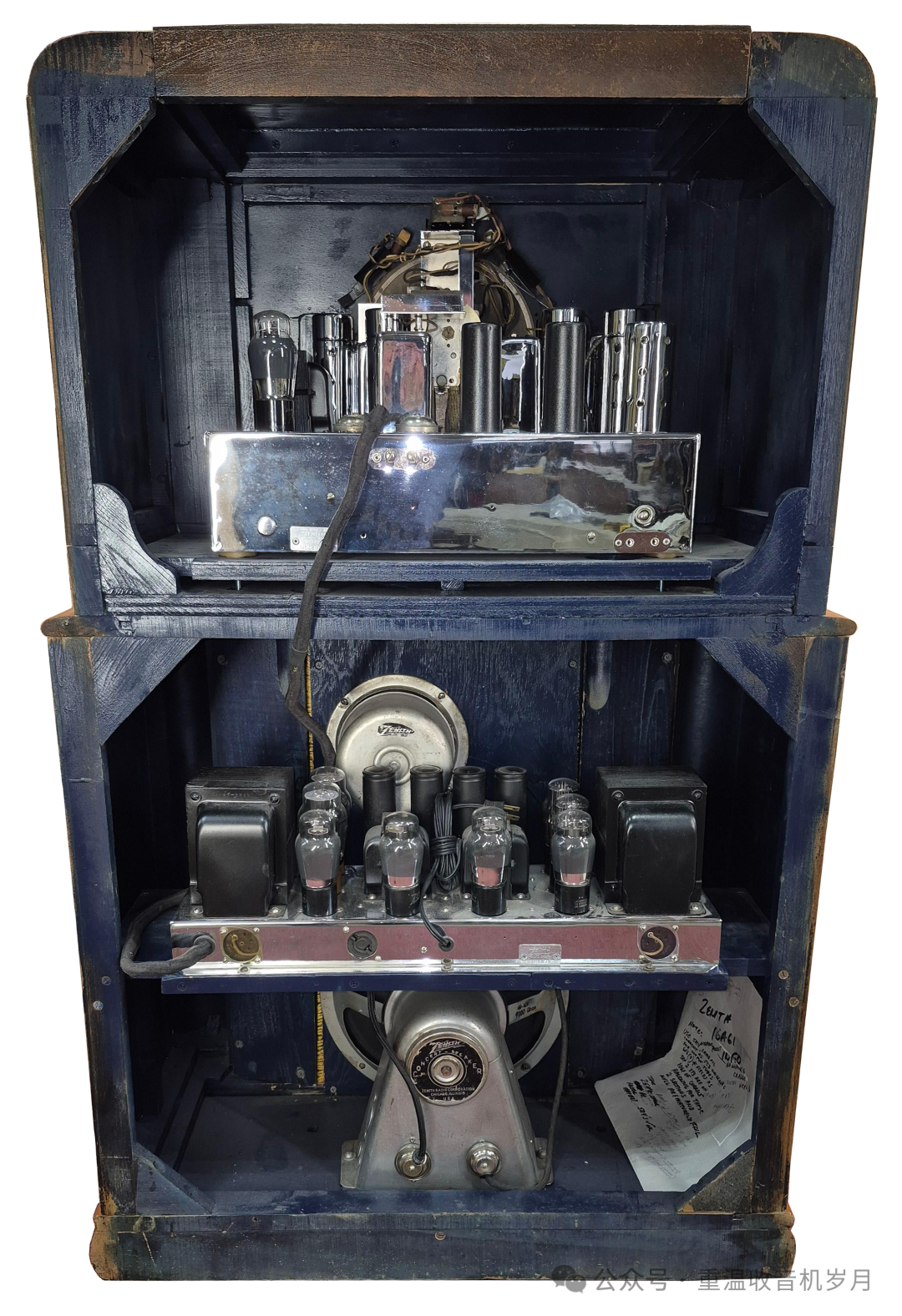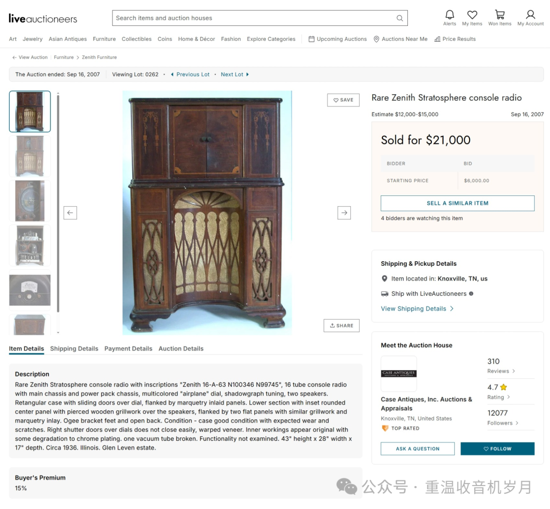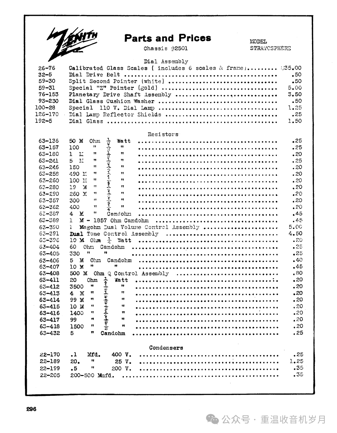 ZENITH STRATOSPHERE 16-A-61 型 —— 16 真空管。可接收美国及海外电台;警用、业余无线电、航空通话、海上船舶电台;同时可接收长波波段美国政府气象报告。1 只礼堂级动圈扬声器,1 只 6 英寸高频重放单元(空间感音色技术)。高保真音质。瞬时重调定位器与影示调谐技术。泛音放大器。双底盘结构。机身高度 47 英寸。售价:295.00 美元。