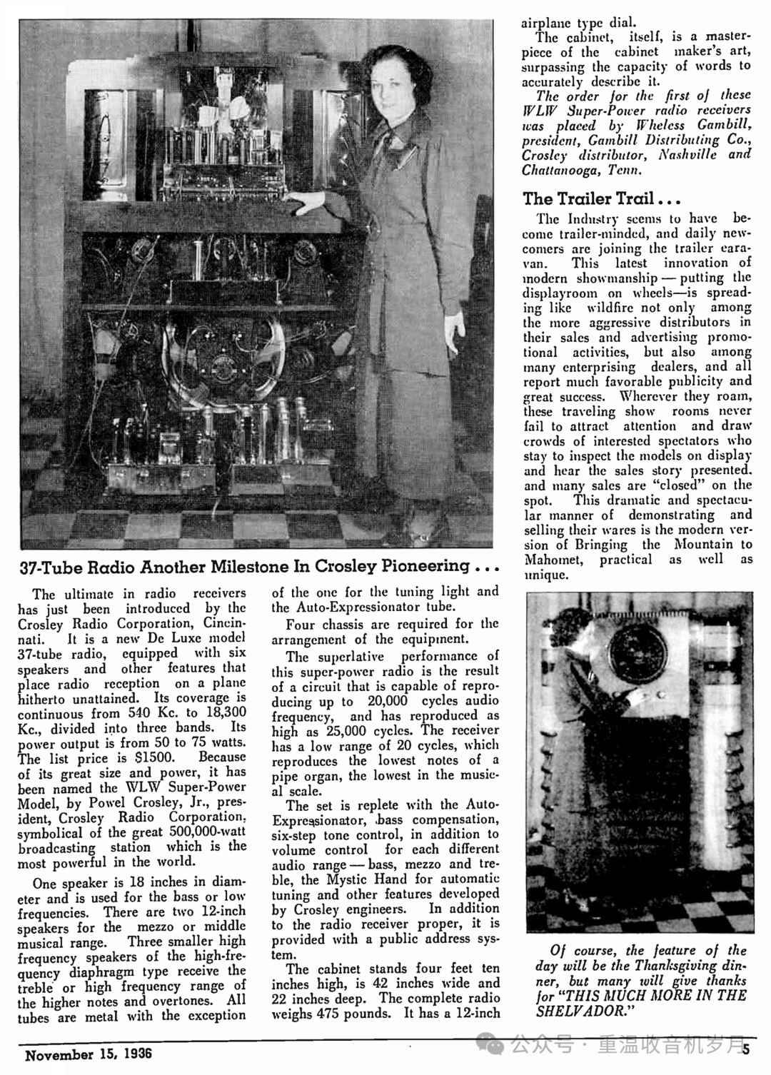 37 管收音机-Crosley开拓路上的又一里程碑,来自1936年11月15日的《Crosley Broadcaster》。文字翻译:
