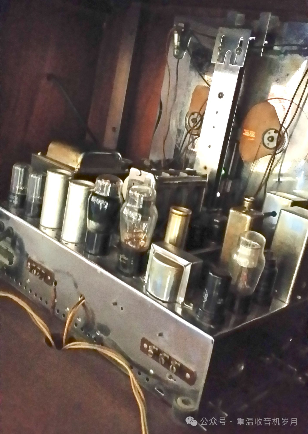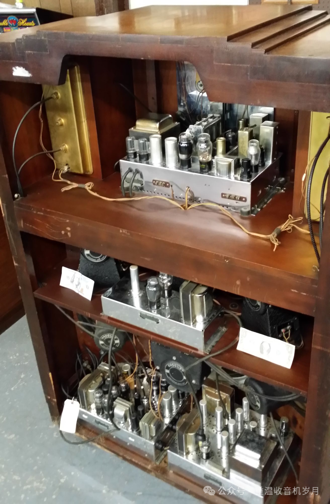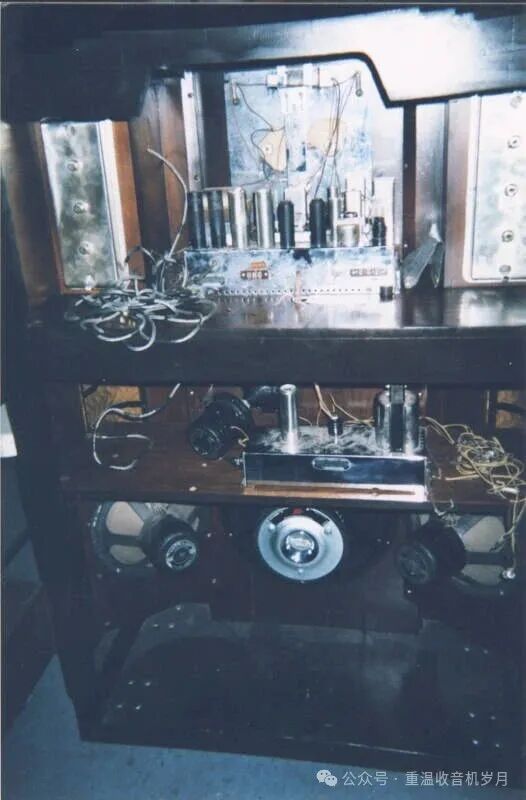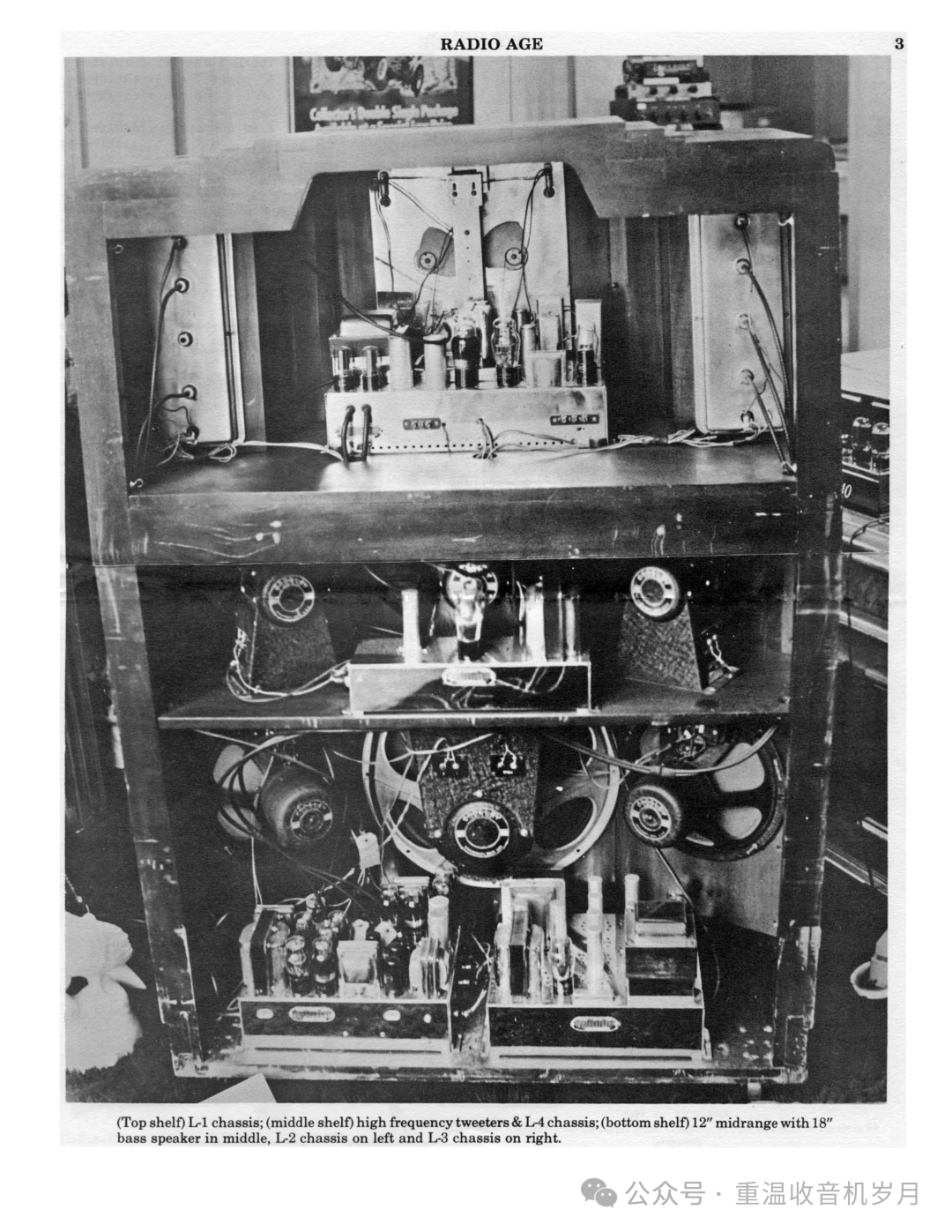 下一层搁板为高频高音扬声器与L-4底盘,L-4底盘通过两只5Z4 MG 真空管为这三只扬声器提供励磁电源。机箱底部为两只12英寸中音扬声器、18英寸低音扬声器,以及L-2底盘与L-3底盘。L-2底盘的真空管型号与功能如下:(略,见原图)