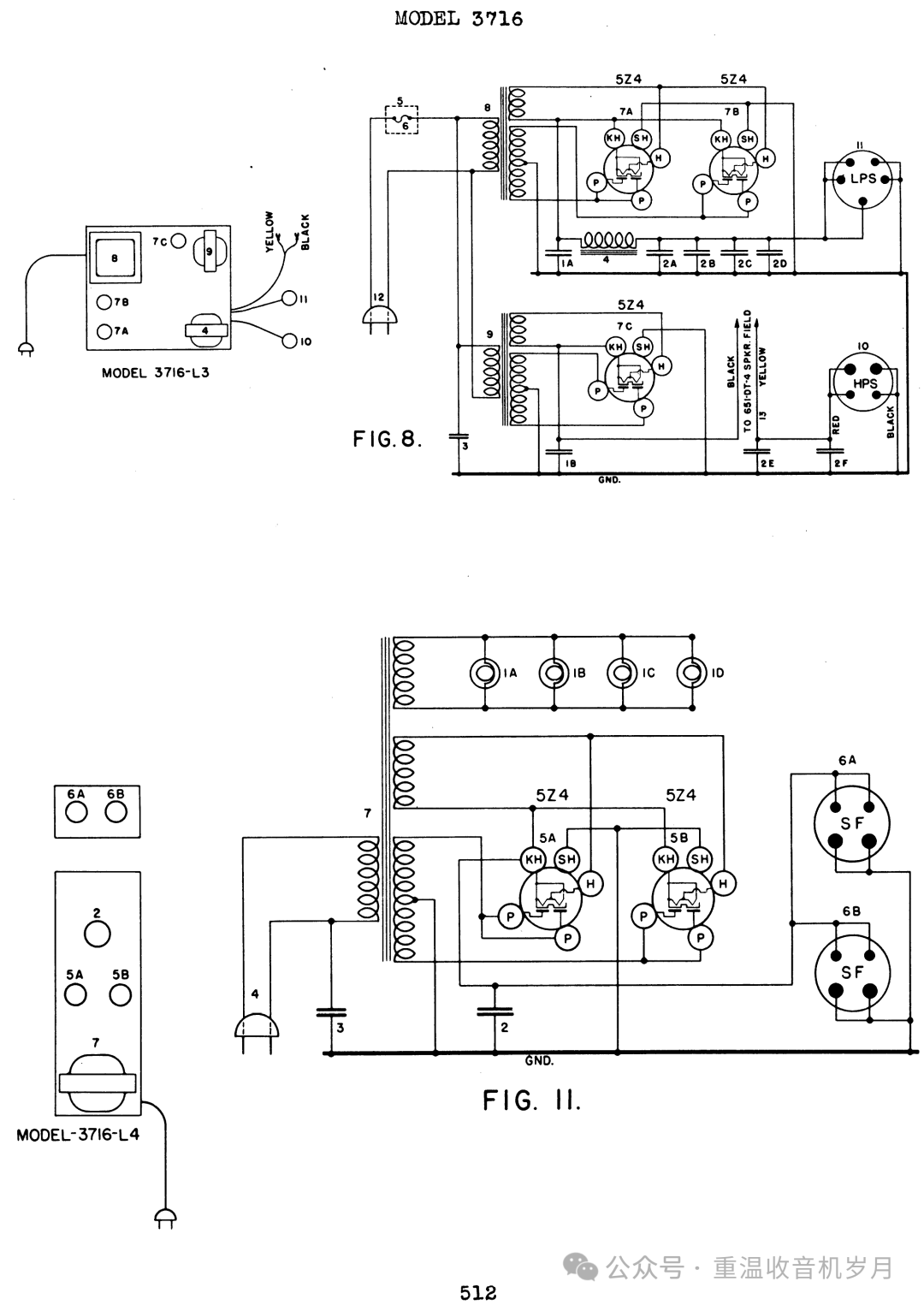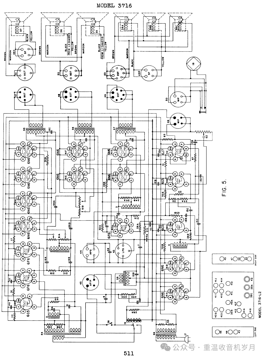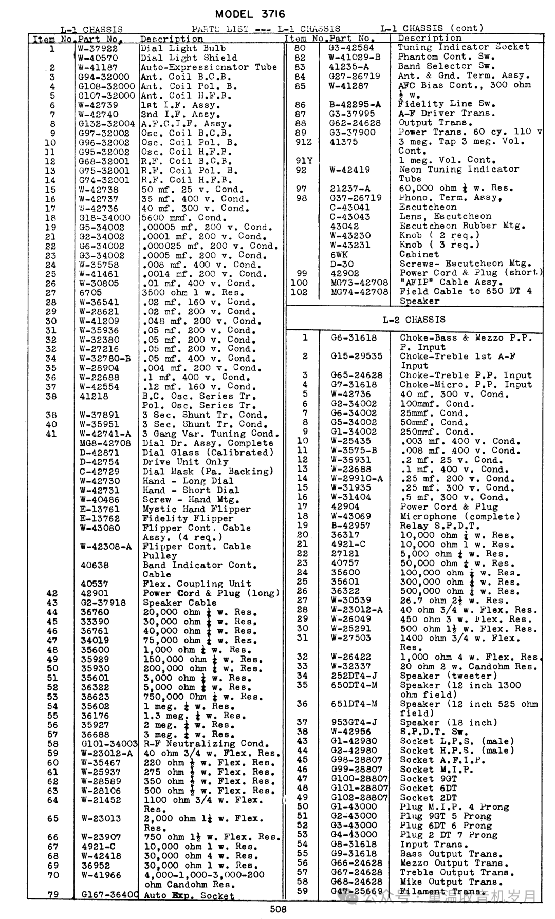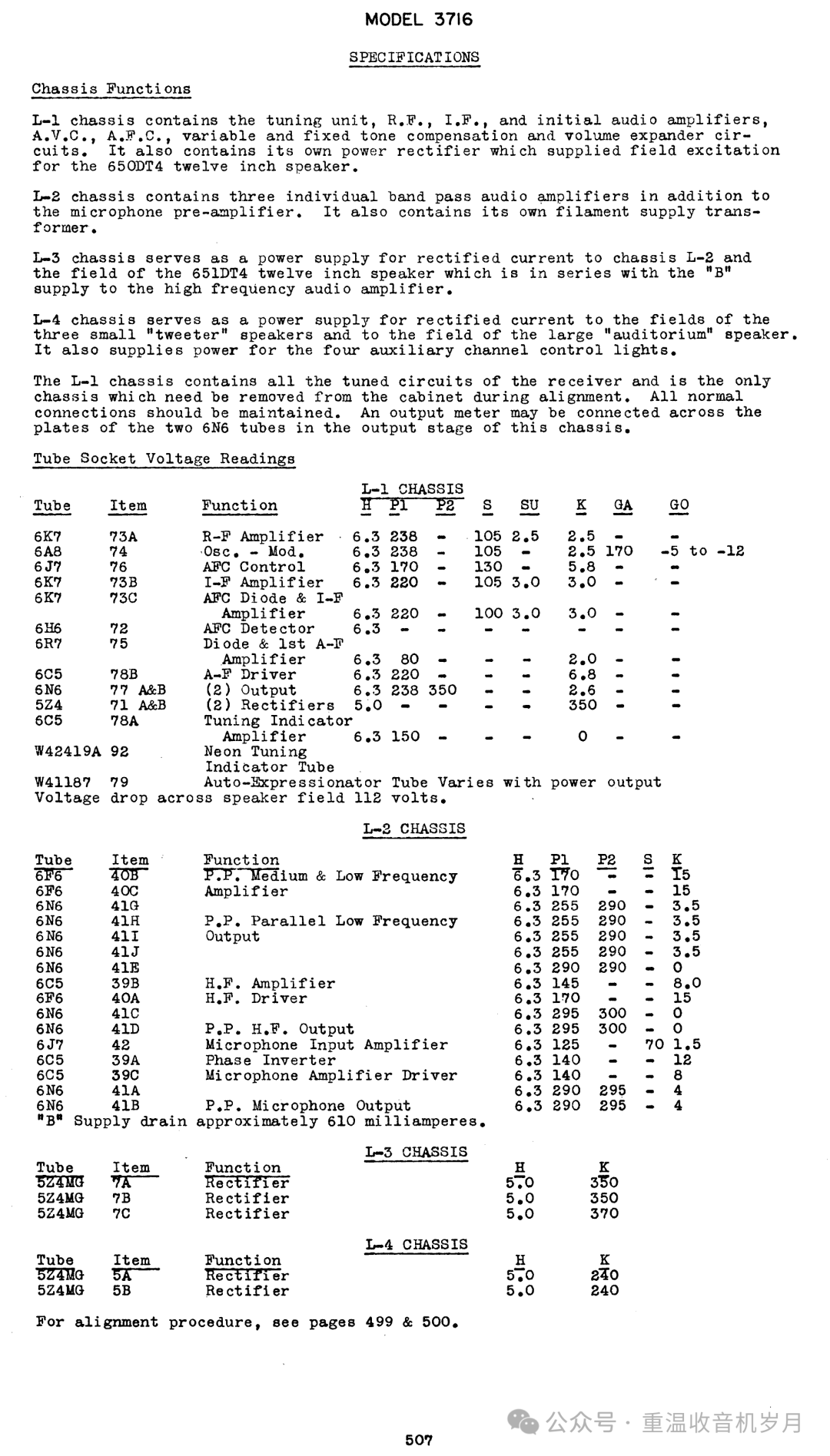 下一层搁板为高频高音扬声器与L-4底盘,L-4底盘通过两只5Z4 MG 真空管为这三只扬声器提供励磁电源。机箱底部为两只12英寸中音扬声器、18英寸低音扬声器,以及L-2底盘与L-3底盘。L-2底盘的真空管型号与功能如下:(略,见原图)