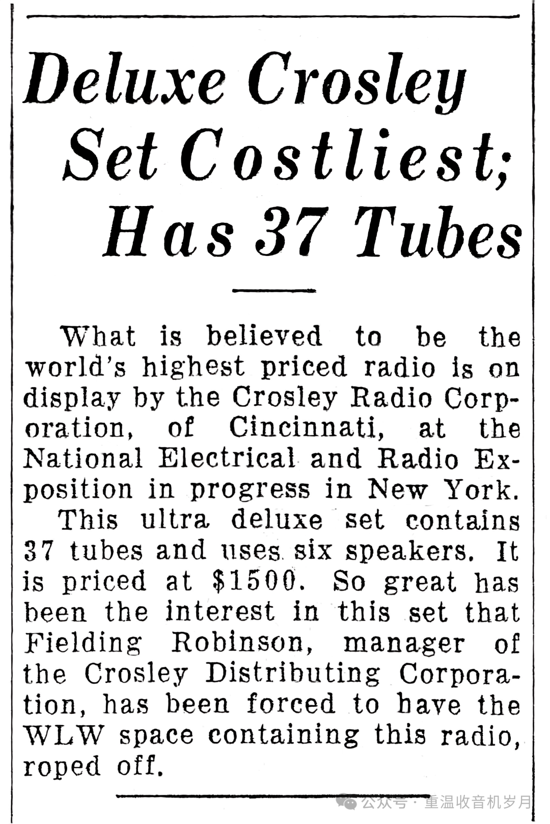 辛辛那提市的Crosley无线电公司正在纽约举办的全国电气与无线电博览会上展出一台据信是全球售价最高的收音机。这款超豪华机型配备 37 只真空管和 6 只扬声器,标价 1500 美元。由于公众对这台收音机兴趣极高,Crosley经销公司经理Fielding Robinson不得不让人用围栏将 WLW 展区内摆放这台收音机的区域隔离起来。
