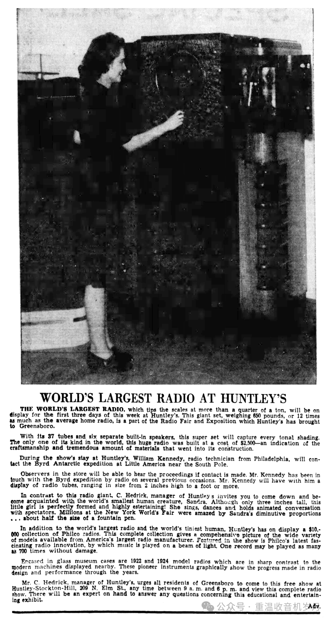 这台全球最大的收音机重量超过四分之一吨,将于本周前三天在Huntley百货展出。这台巨型整机重达650磅,是普通家用收音机的12倍,是Huntley百货带到Greensboro的无线电展览会的核心展品之一。