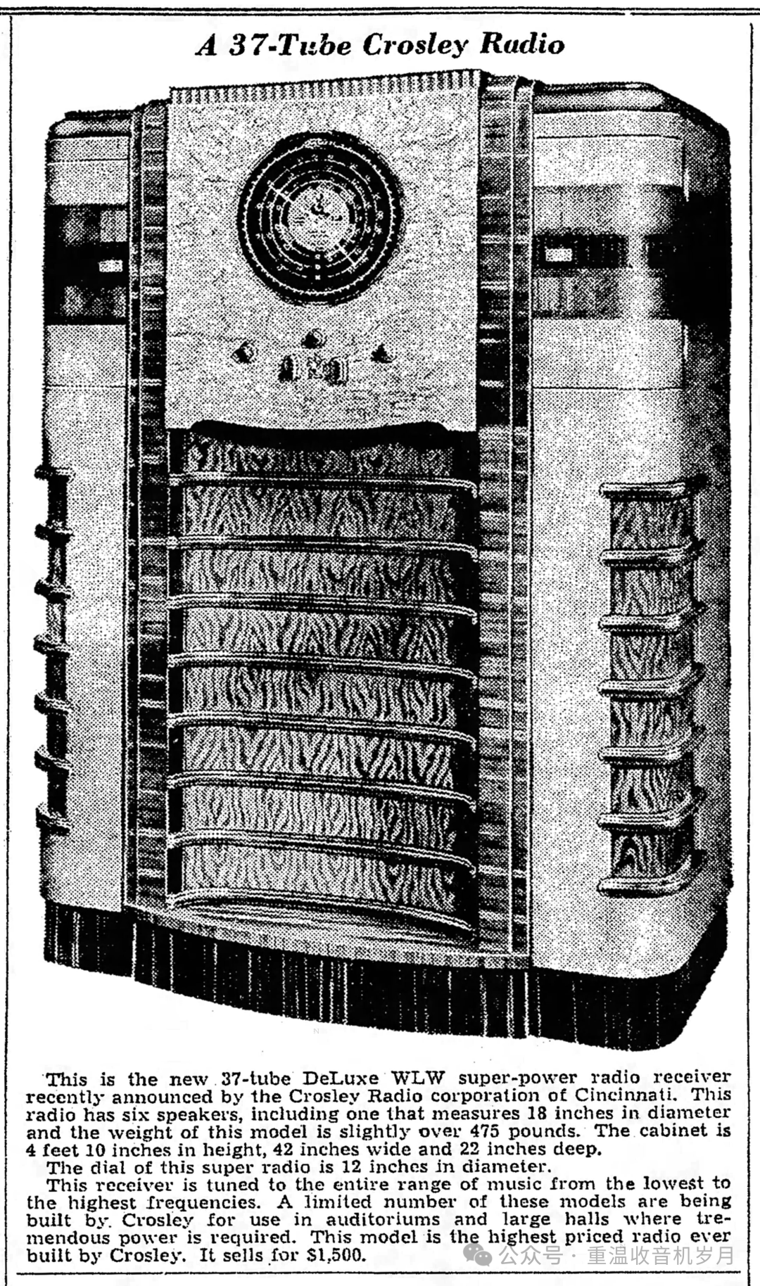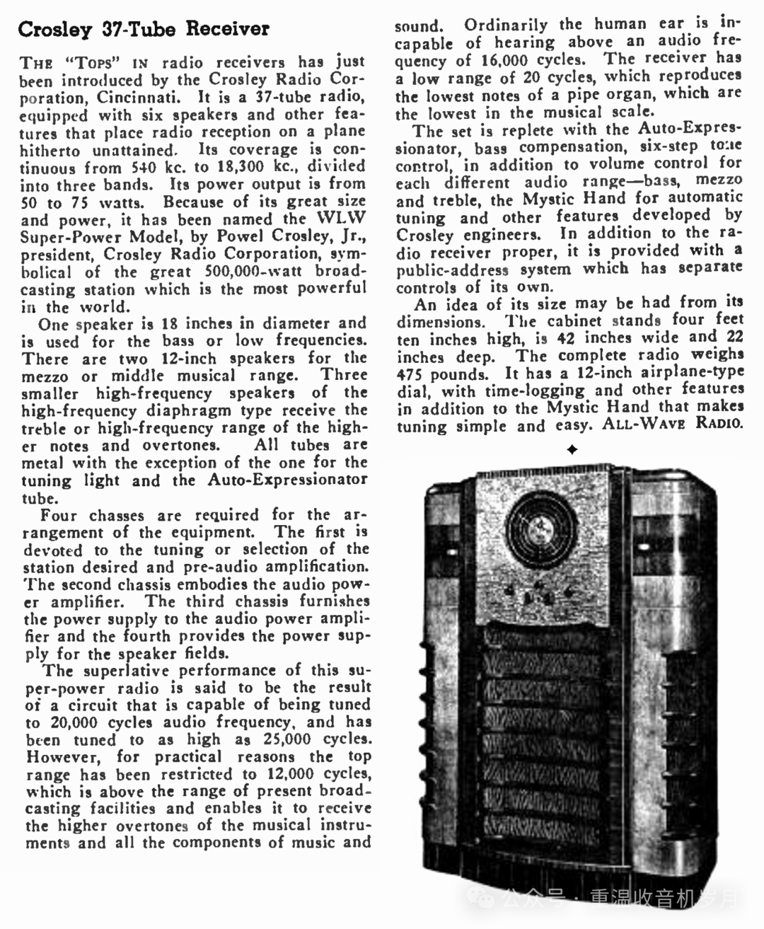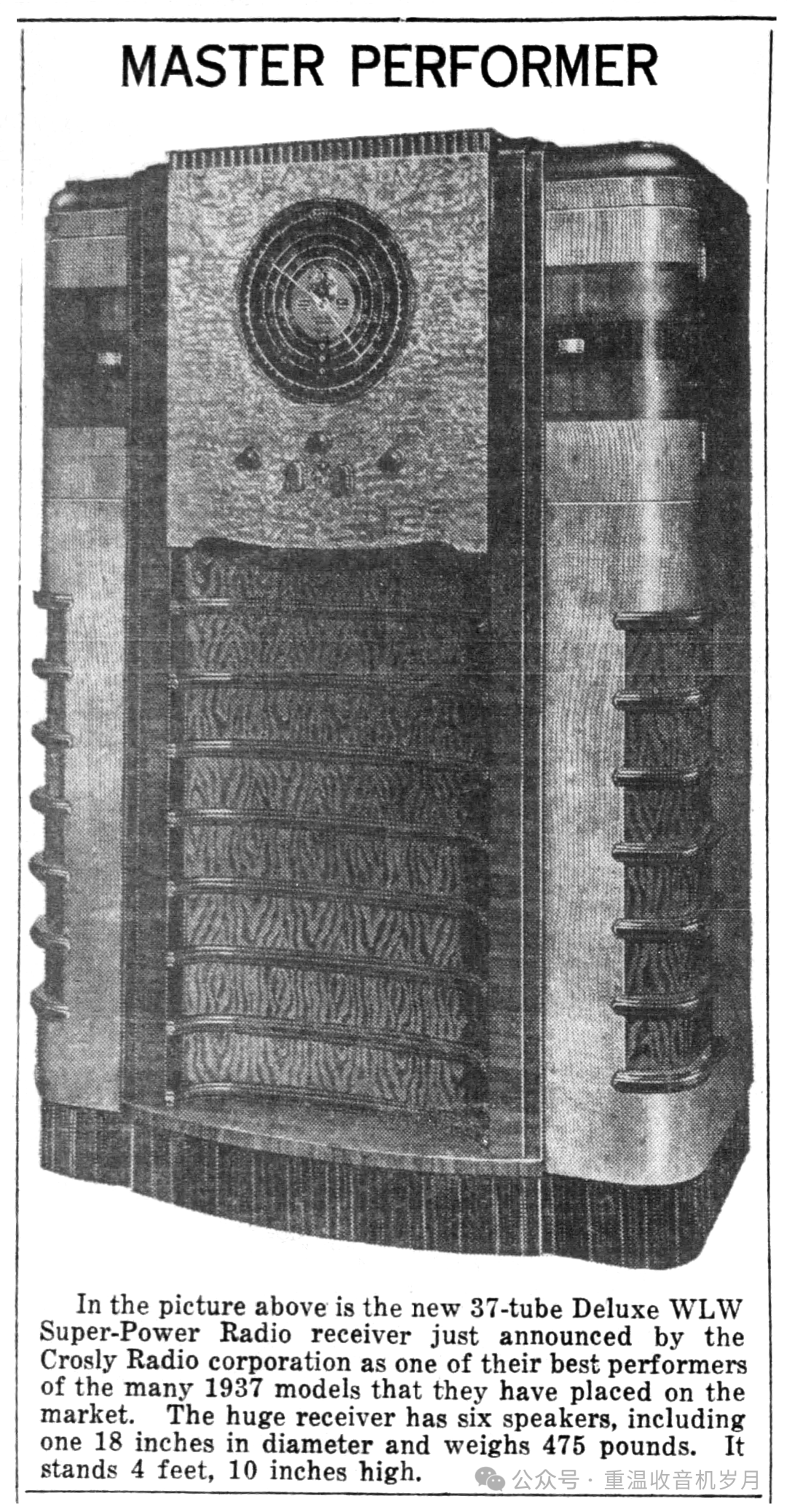 这是辛辛那提Crosley无线电公司近期发布的全新 37 管豪华款 WLW 超强功率收音机。这款收音机配备 6 只扬声器,其中 1 只直径为 18 英寸,整机重量略超 475 磅。机身机柜高 4 英尺 10 英寸、宽 42 英寸、深 22 英寸。