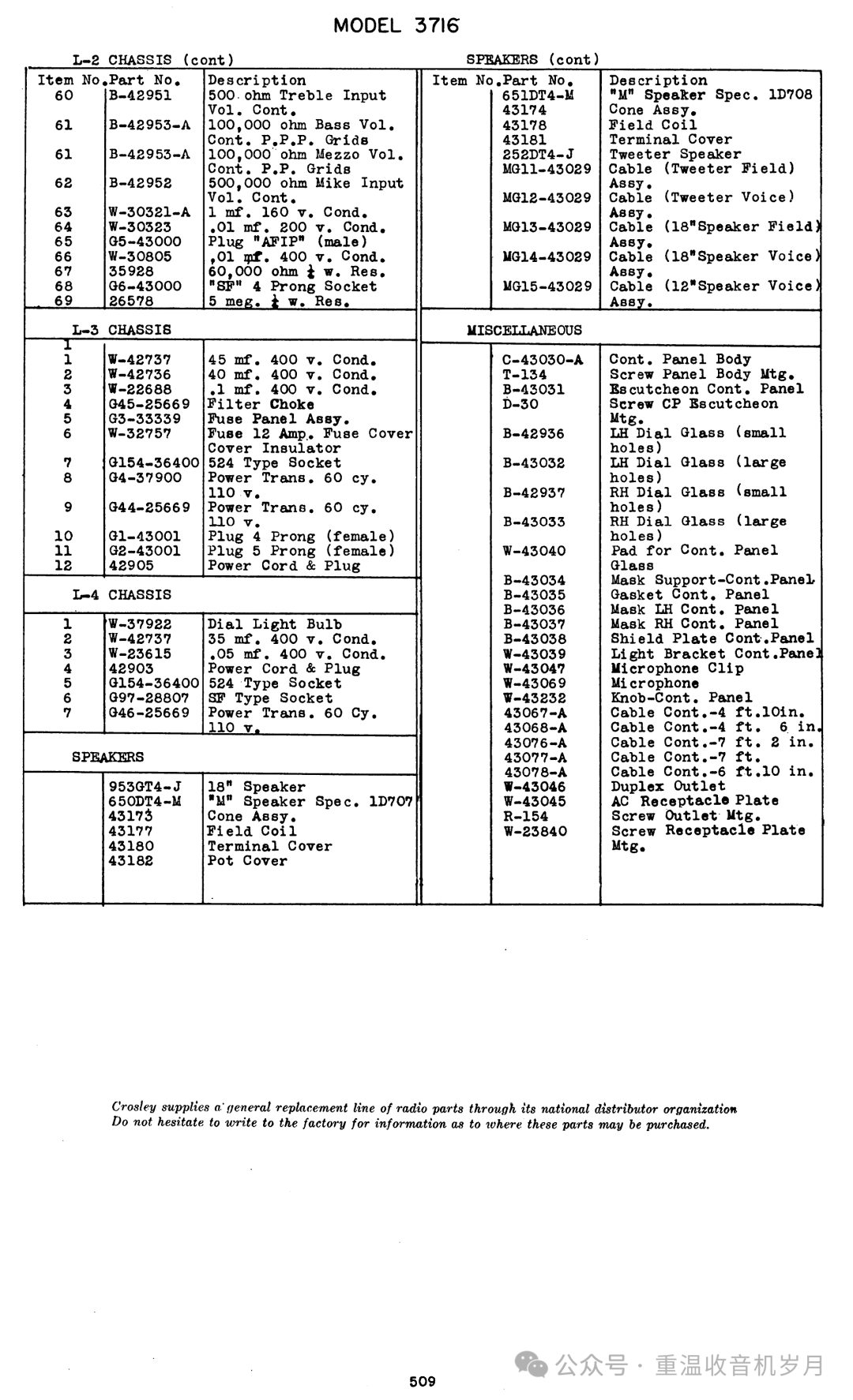 Crosley 3716(WLW)的电路资料,来自《The Crosley Radio Service Manual, Revised and Abridged Edition Covering 1943 Sets and Earlier》