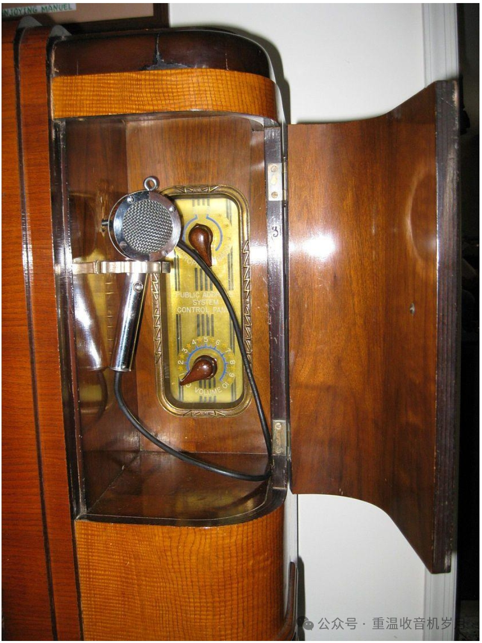 4. 公共广播控制:这些控制位于机柜右侧检修门后的内部隔舱内,如图所示。面板顶部标注有“麦克风-收音机”的开关,用于切换设备的公共广播或收音重放模式。当开关拨至“A”档时,操作者可同时使用收音或公共广播功能;例如,若操作者想中断广播节目进行播报,只需按下麦克风上的按钮即可。当开关拨至“B”档时,操作者可在收听广播节目的同时使用公共广播系统。