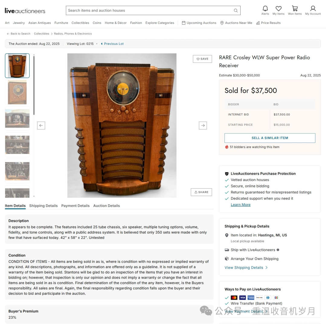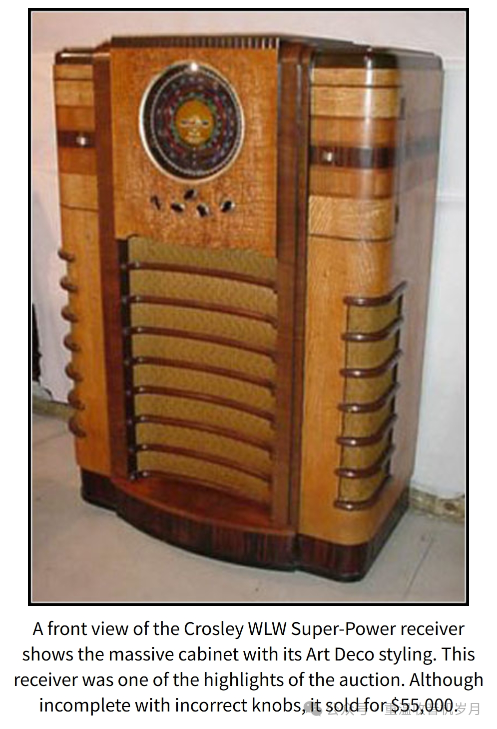 2014年5月17日,前述《Radio Age》文章中介绍的同一台Crosley WLW收音机成为Estes 拍卖行(在美国俄亥俄州,是全球古董收音机收藏领域最具影响力的专业拍卖行之一)举办的拍卖会上的拍品,最终以7万美元的价格成交(不含佣金和税费),由Sam Samuelian拍得。同时拍卖的Zenith Stratosphere 1000Z以3.7万美元的价格成交。以上实物图片为拍卖前拍摄。