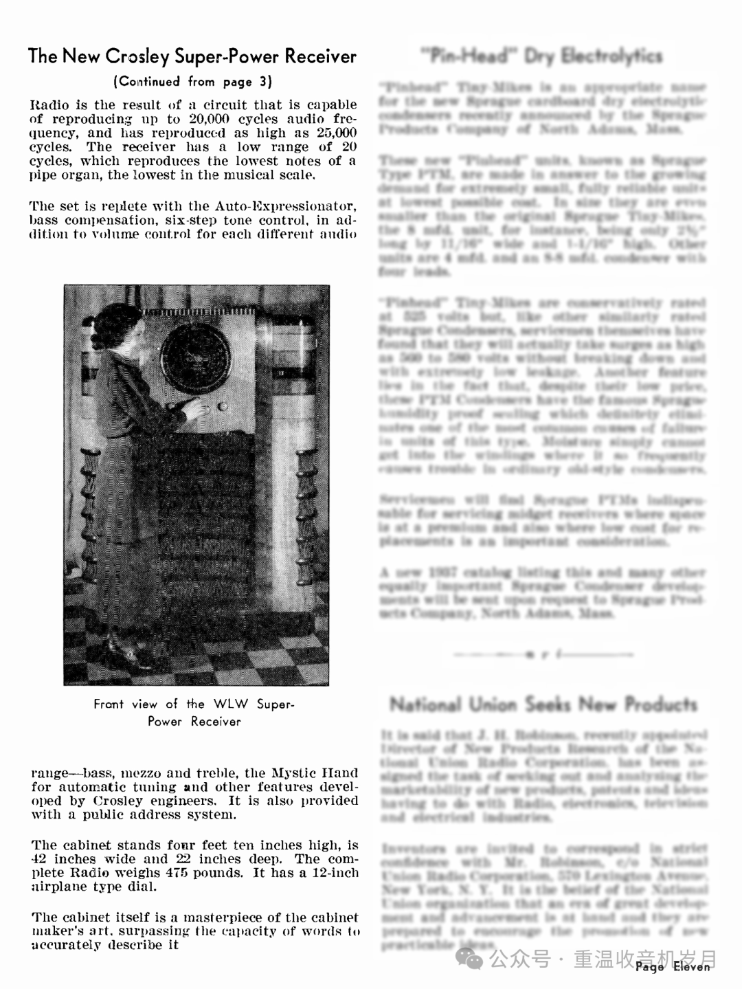 新型 Crosley 超强功率接收机,来自《National Radio News》1937年2月-3月号。文字翻译: