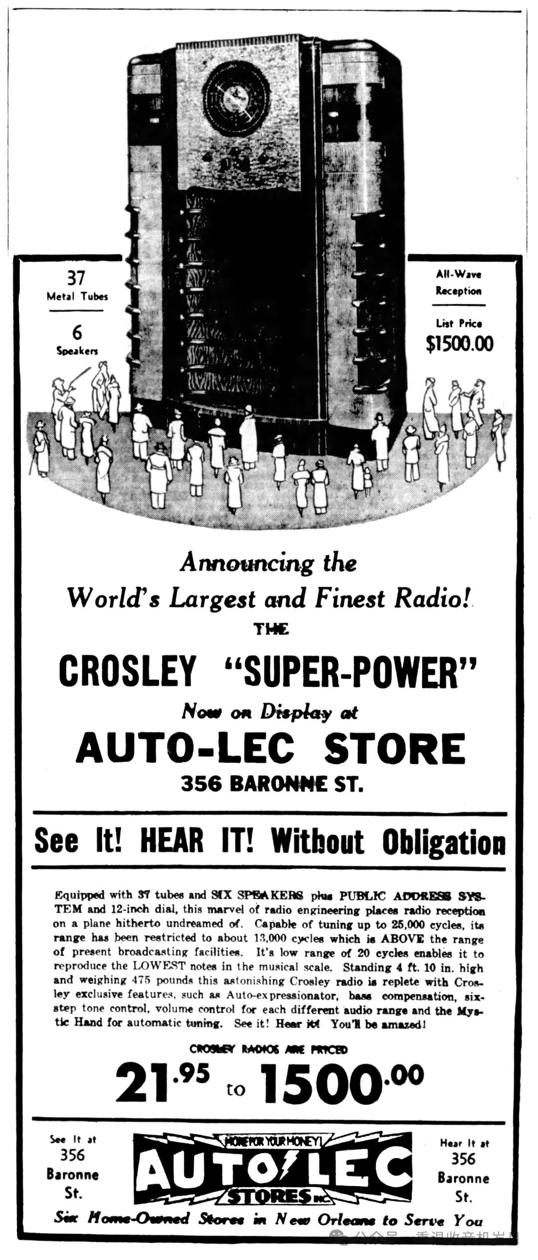 辛辛那提的Crosley无线电公司刚刚推出了收音机接收机领域的巅峰之作。这是全新的豪华款37管收音机,配备6只扬声器及多项创新功能,将收音机接收性能提升到了前所未有的高度。其接收频段连续覆盖540千赫至18,300千赫,划分为3个波段,功率输出为50至75瓦,标价1500美元。因其庞大的体积与强劲的功率,该机型被命名为WLW Super-Power Model,以此象征那座功率达500,000瓦、全球功率最强的广播电台。