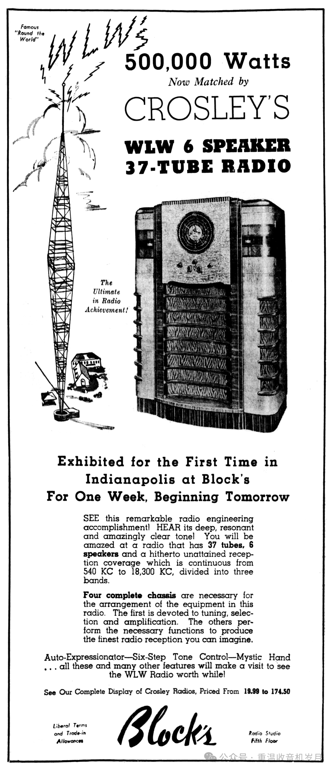 收音机领域的“巅峰之作”,由辛辛那提的Crosley无线电公司全新推出。这是一款37管收音机,配备6只扬声器及多项创新功能,将收音机接收性能提升到了前所未有的全新高度。其接收频段连续覆盖540千赫至18,300千赫,划分为3个独立波段,功率输出为50至75瓦。Crosley无线电公司总裁Powel Crosley, Jr.为其命名为WLW Super-Power Model,以此象征那座功率达500,000瓦、全球功率最强的广播电台。