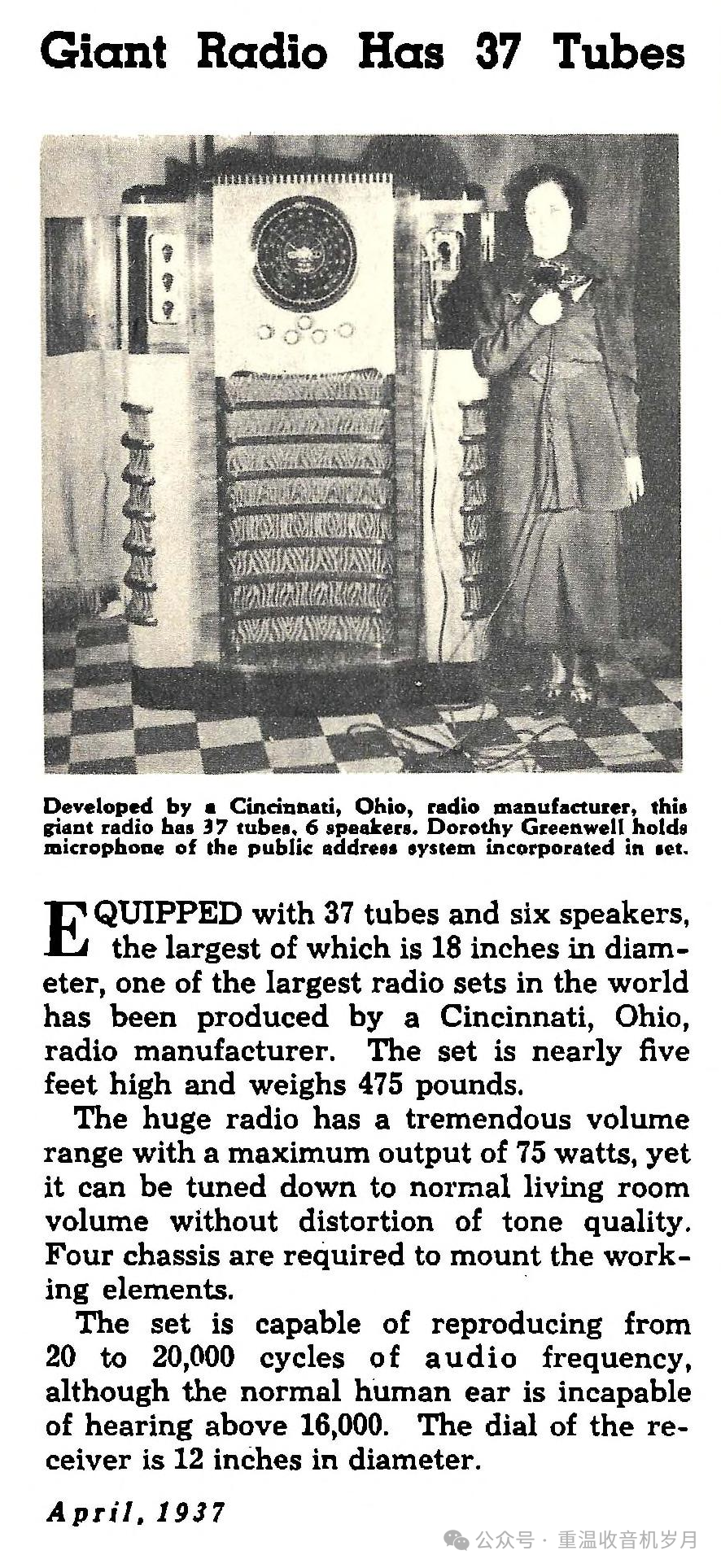 上图展示的是Crosley无线电公司刚刚发布的全新 37 管豪华型 WLW 超强功率收音机,该机型是其 1937 年推向市场的众多机型中性能最出色的产品之一。这款巨型接收机配备 6 只扬声器,其中包含 1 只直径 18 英寸的扬声器,整机重 475 磅,高度为 4 英尺 10 英寸。