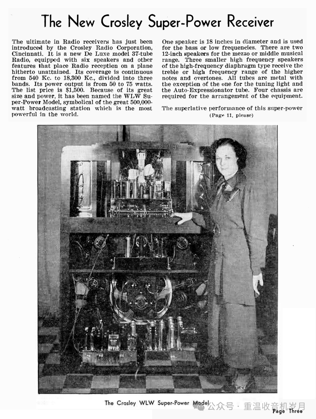 辛辛那提的Crosley无线电公司刚刚推出了这款顶级收音机。这是全新的豪华款37管收音机,配备6只扬声器及多项创新功能,将收音机接收性能提升到了前所未有的高度。其接收频段为540千赫至18,300千赫连续覆盖,分为三个波段。功率输出为50至75瓦,标价1500美元。Crosley无线电公司总裁Powel Crosley, Jr.因其庞大的体积与强劲的功率,将其命名为WLW Super-Power Model,以此象征这座功率达500,000瓦、全球最强的广播电台。
