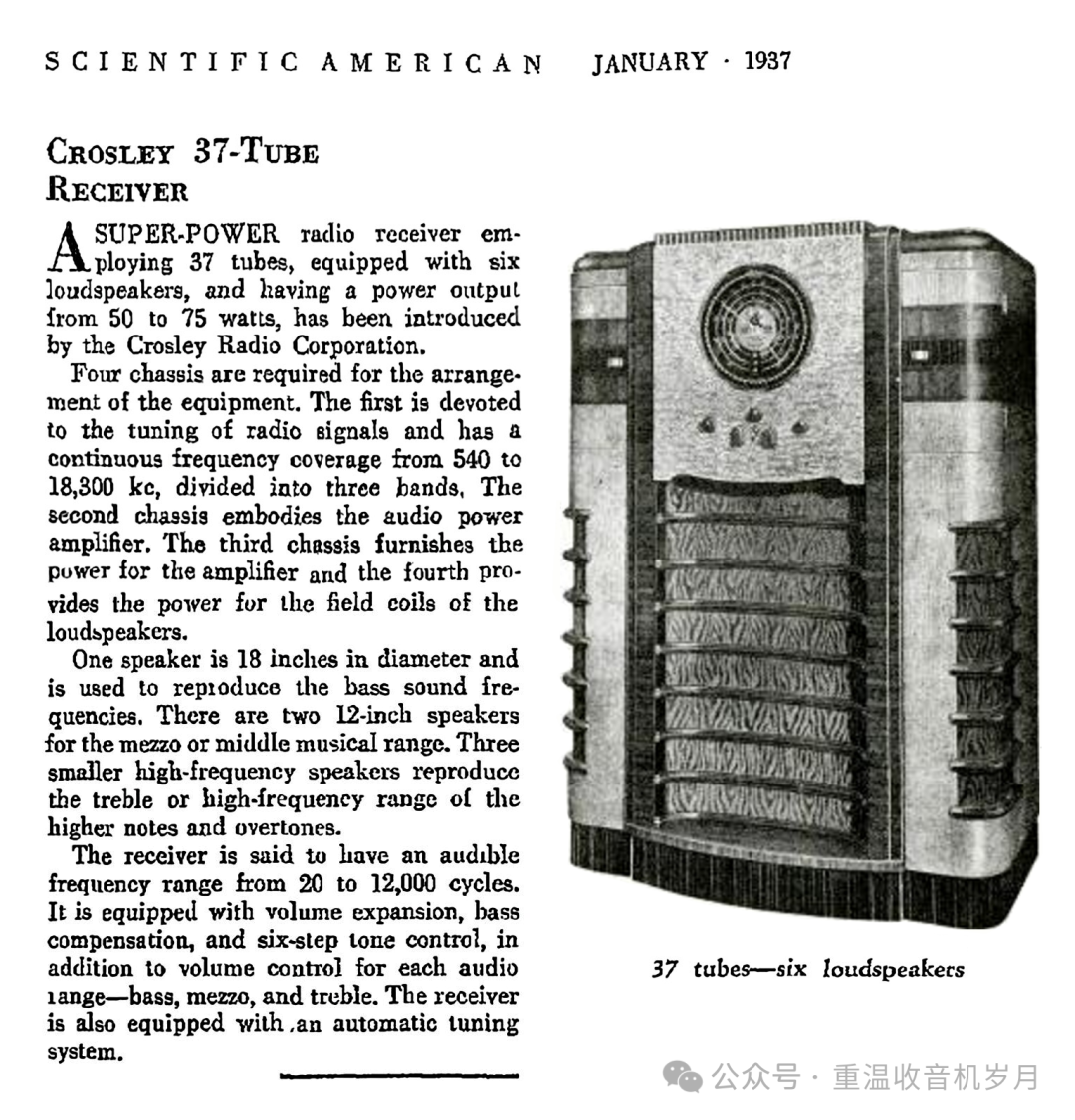 Crosley 37 管收音机介绍,来自《Scientific American》1937年1月号。文字翻译: