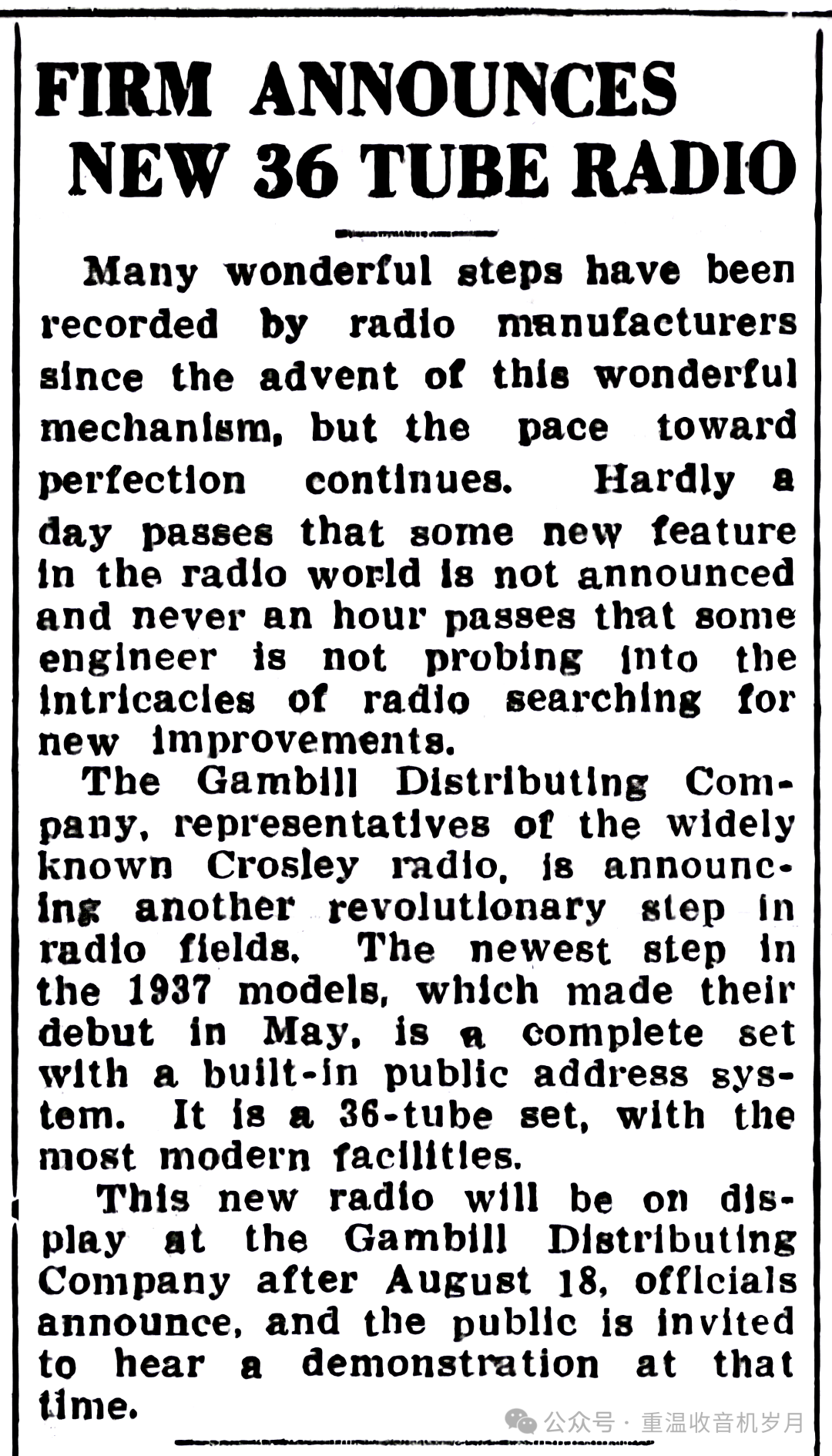 知名 Crosley收音机的代理商 ——Gambill分销公司,今日宣布在无线电领域取得又一项革命性突破。今年 5 月首次亮相的 1937 款系列机型中,最具创新性的产品是一套内置公共广播系统的完整收音机设备。这款 36 真空管收音机配备了最先进的技术配置。