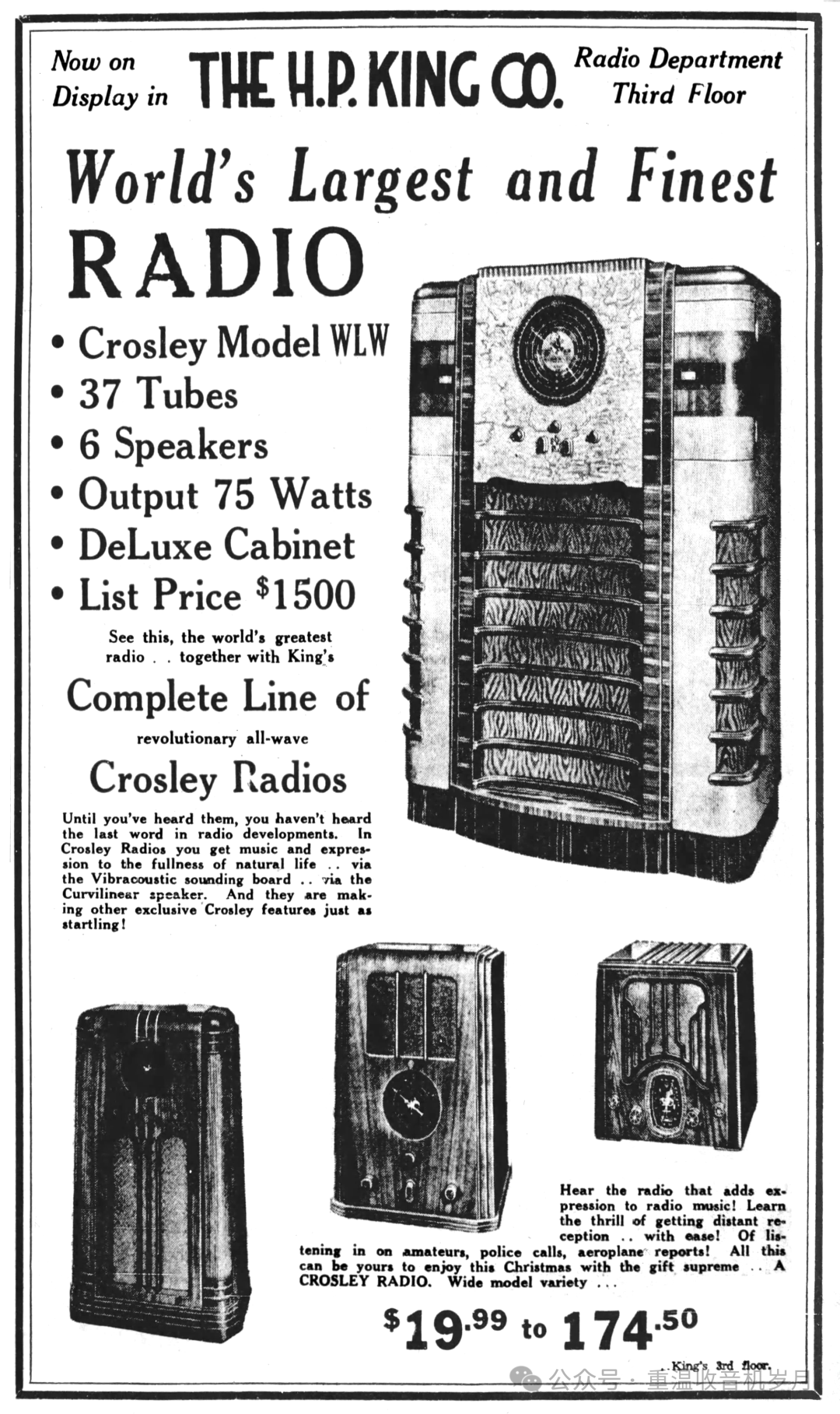Crosley WLW收音机广告,来自《The Times Picayune》1936年12月6日第8版。