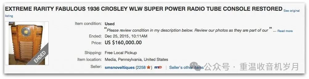 中标买家Sam Samuelian拍摄的Crosley WLW收音机照片。2015年11月,Sam Samuelian试图在ebay以16万美元的价格出售该机,但因价格过高,并无买家出价。